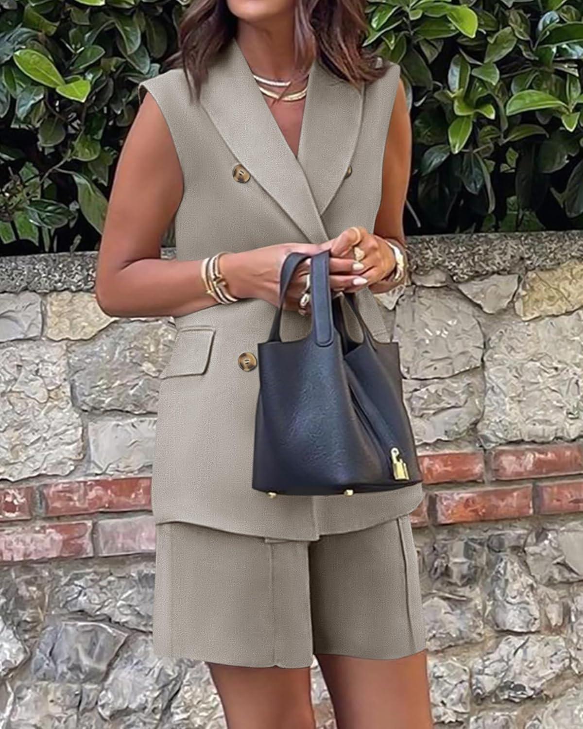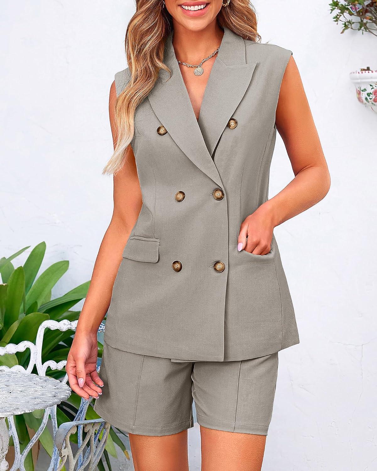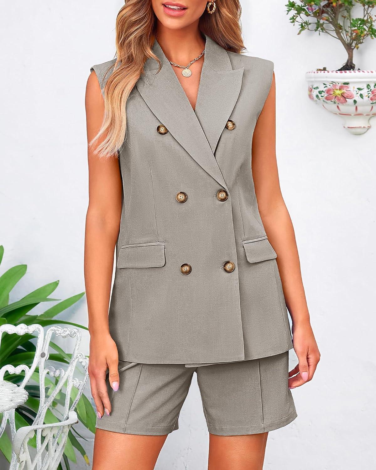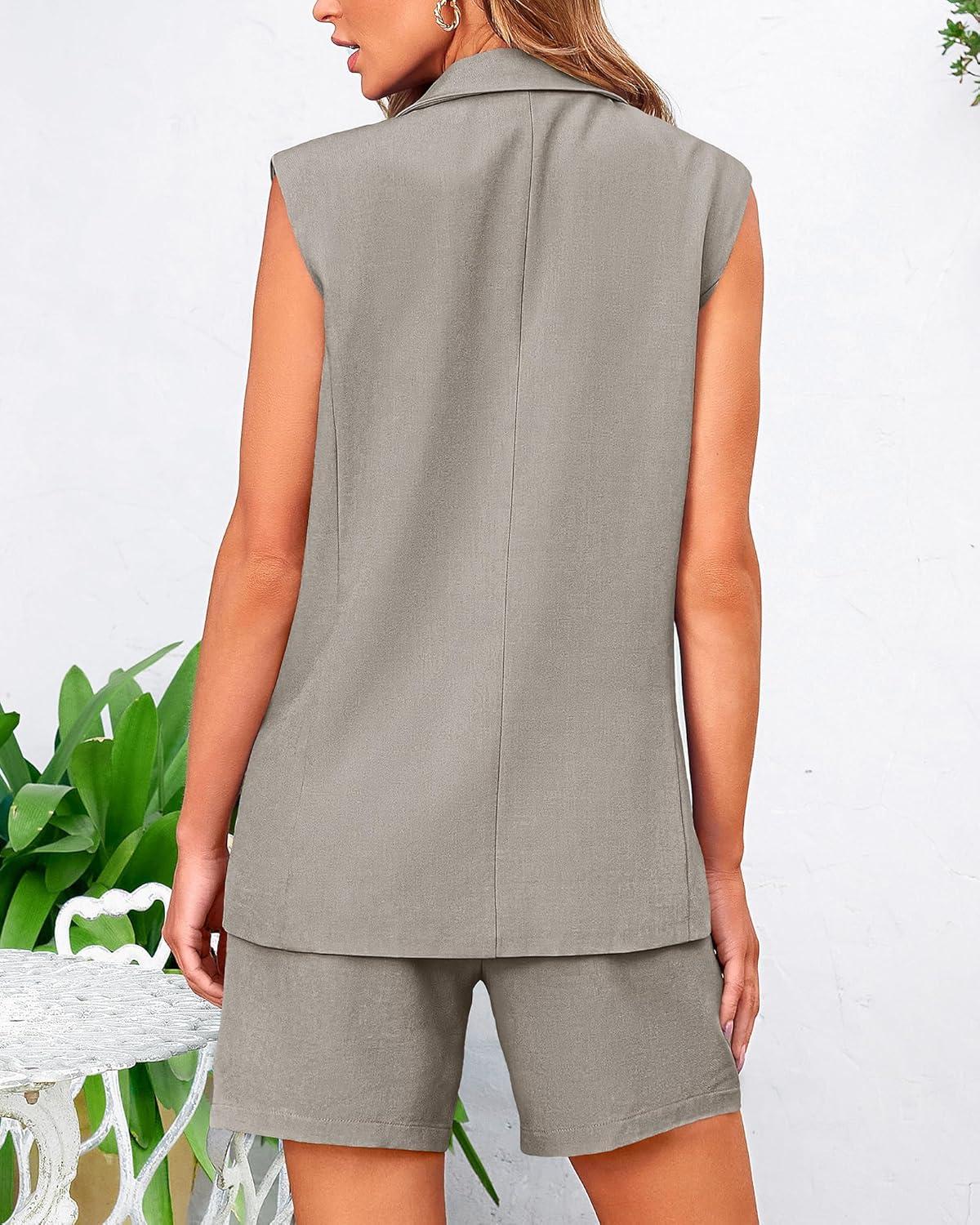 BTFBM 2 Piece Outfits For Women Summer 2025 Sleeveless Button Down Business Casual Vest Shorts Sets Work Clothes Pockets(Light Grey)