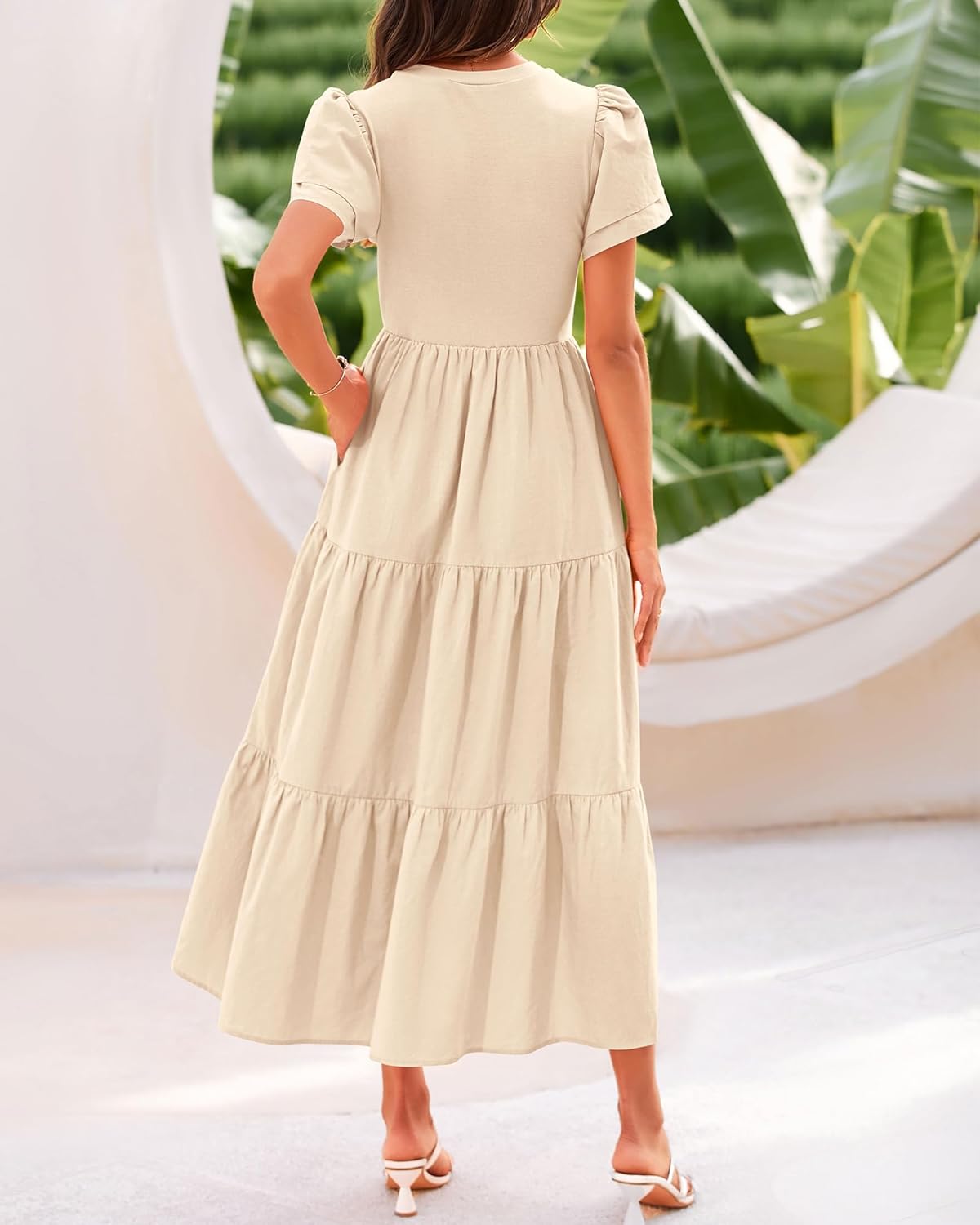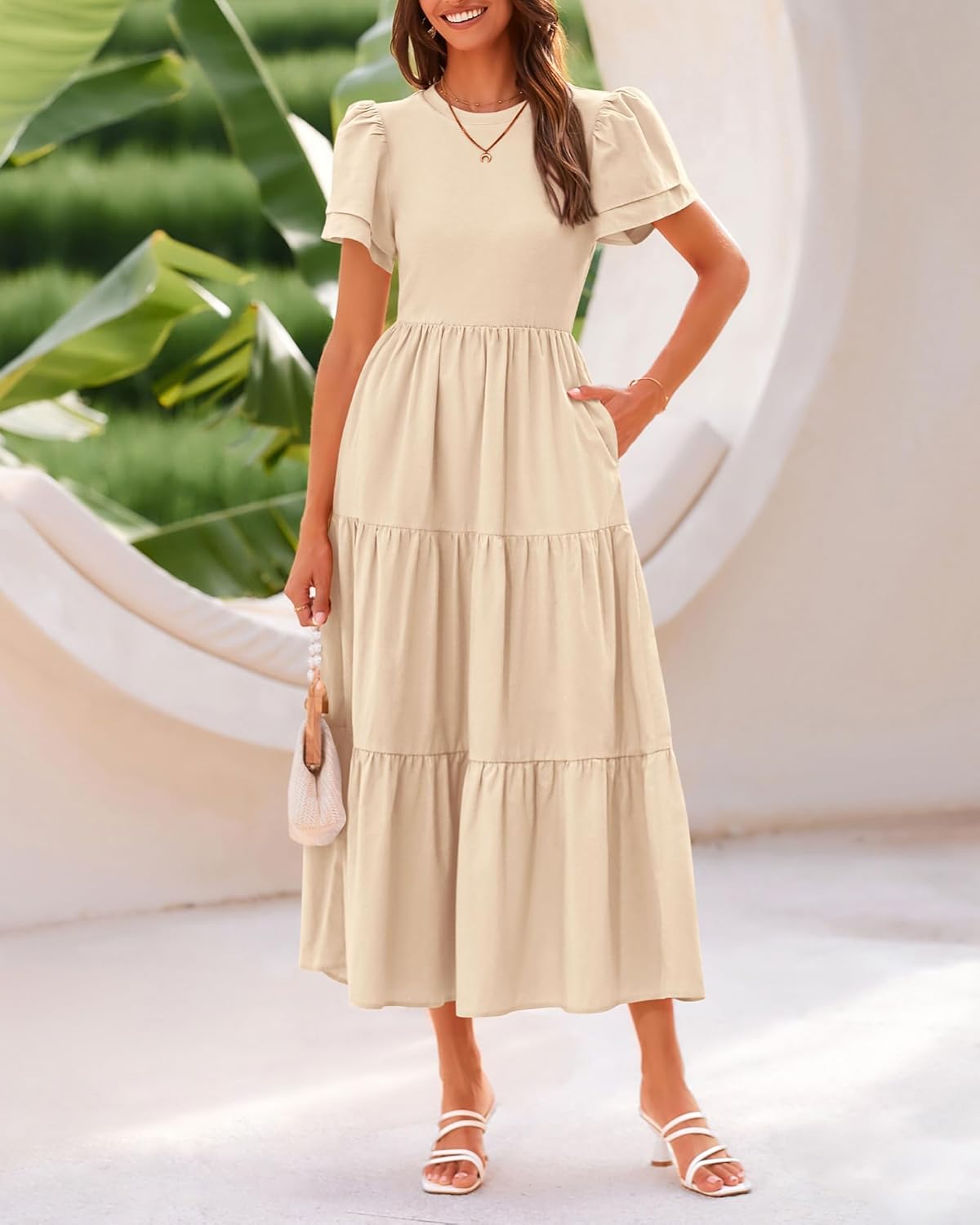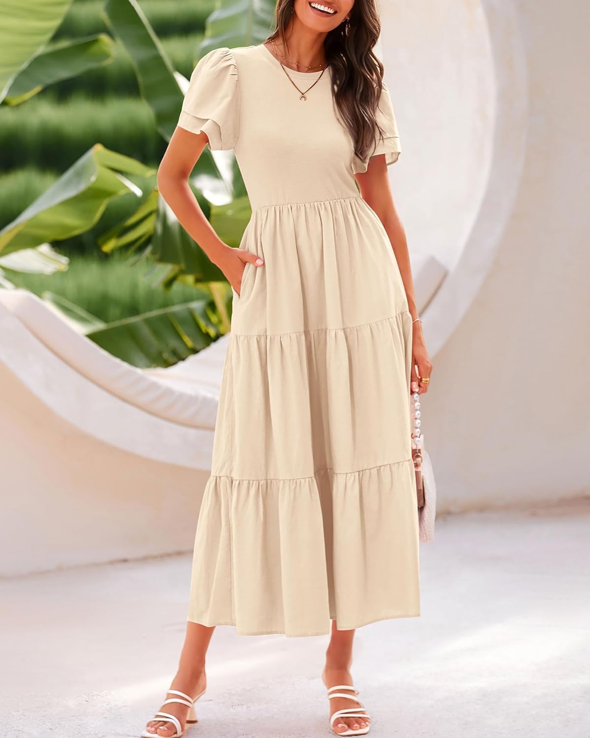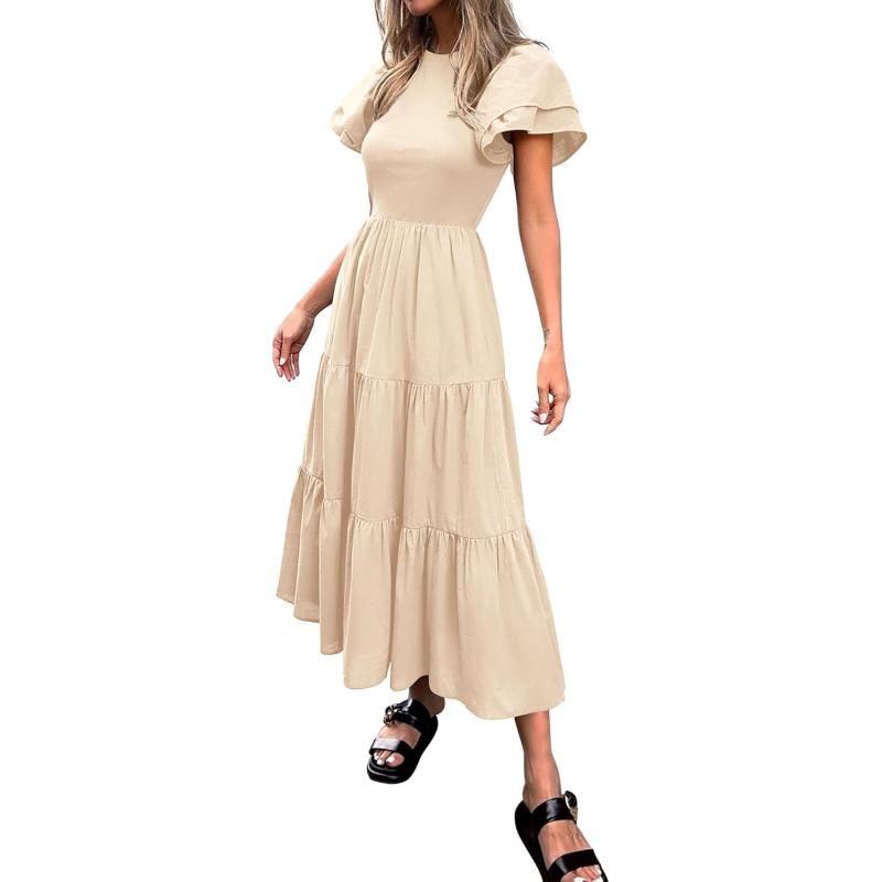 BTFBM 2024 Women Casual Summer Dresses Crewneck Flutter Short Sleeve Elastic Waist Flowy Aline Tiered Maxi Dress Pockets(Solid Beige)