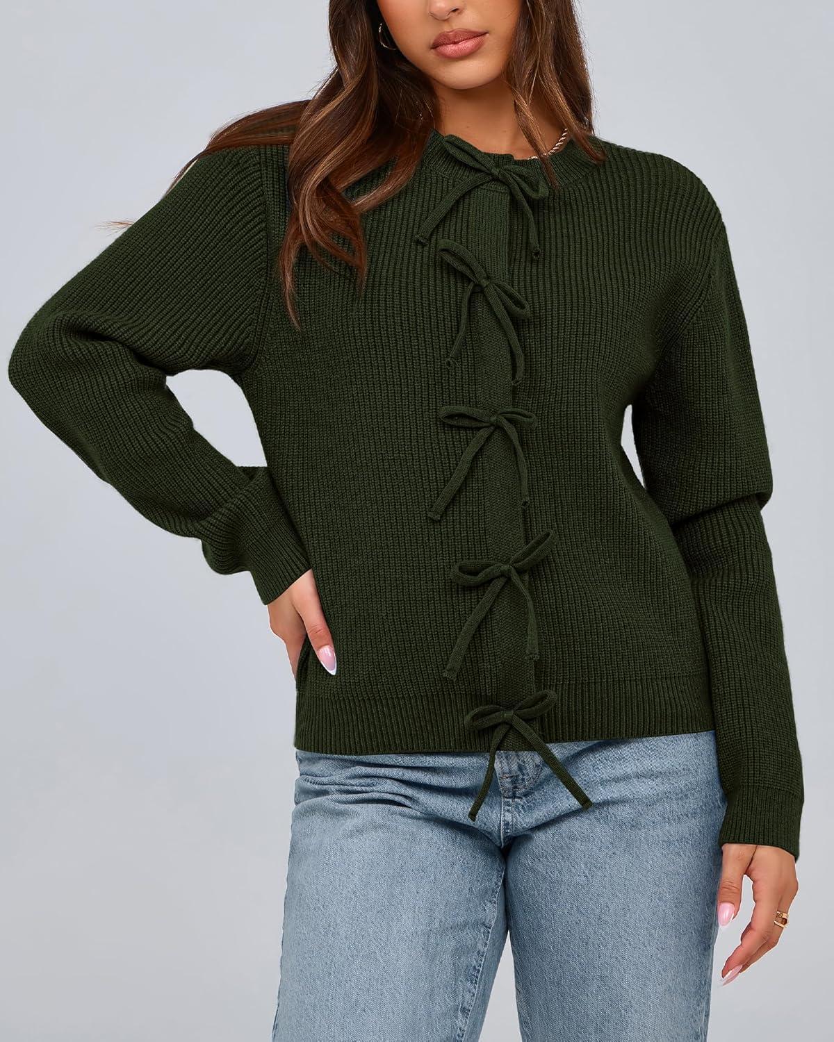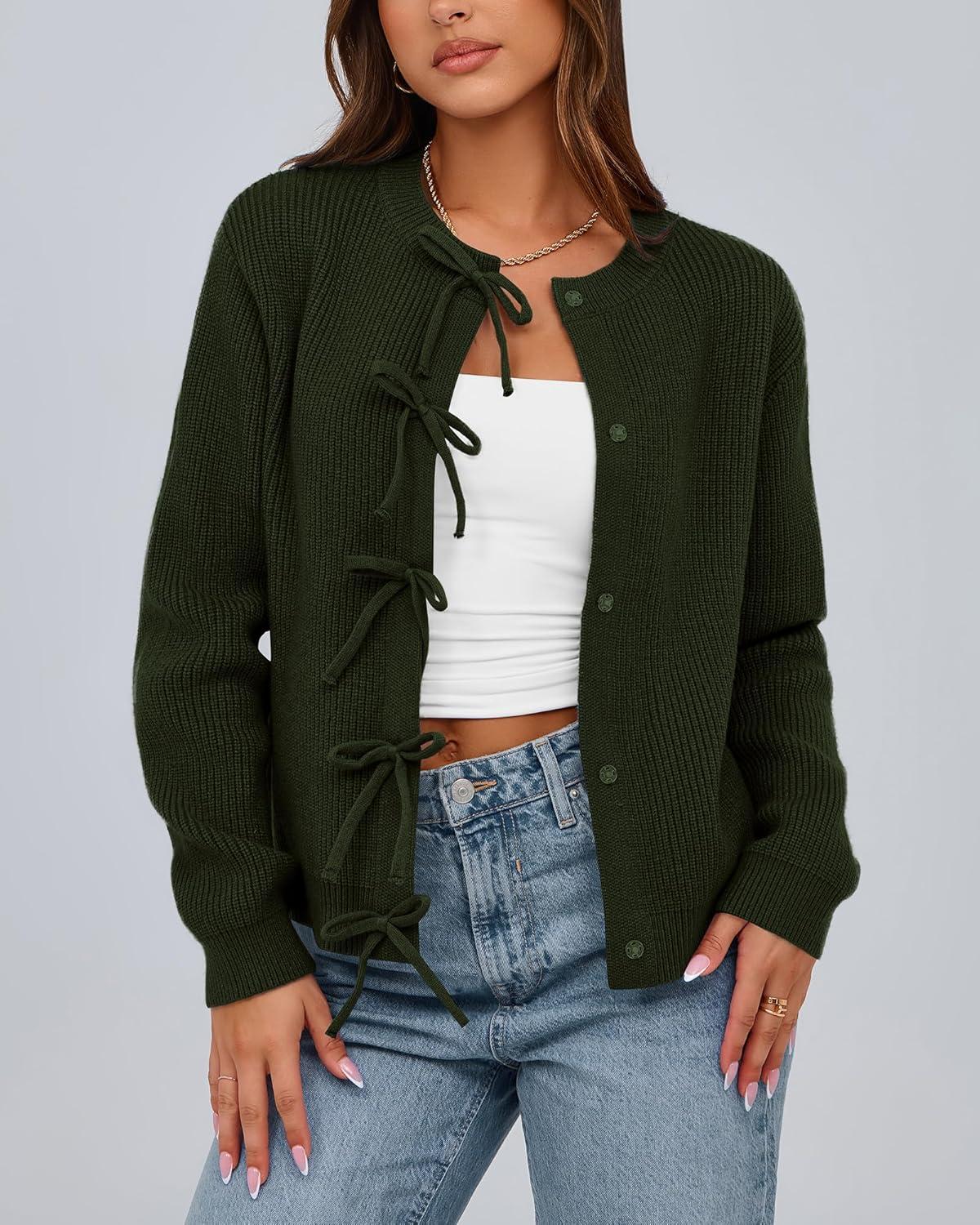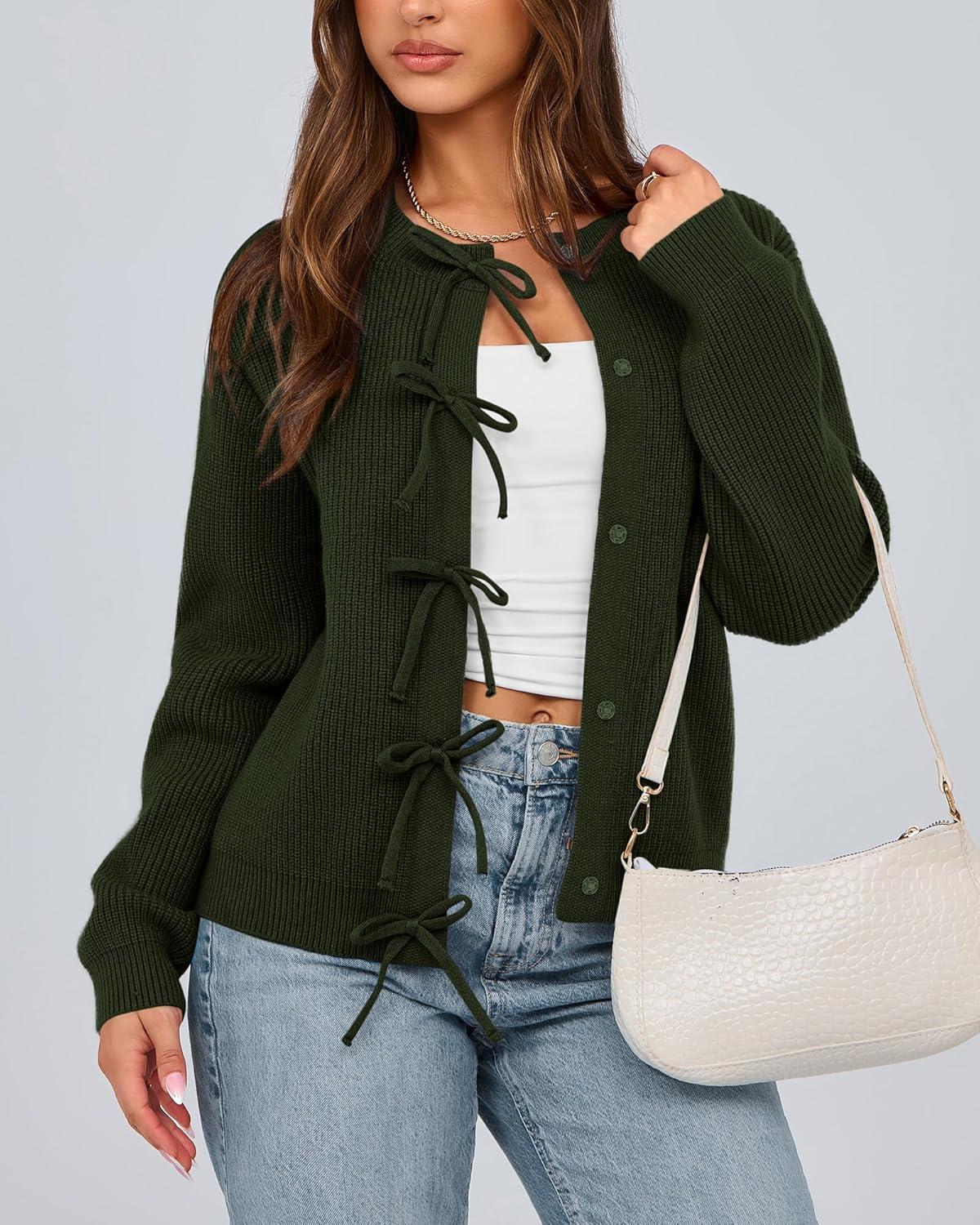 BTFBM Bow Cardigan Sweaters for Women Trendy 2025 Fall Winter Open Front Long Sleeve Button Down Cropped Lady Jacket(Army Green)