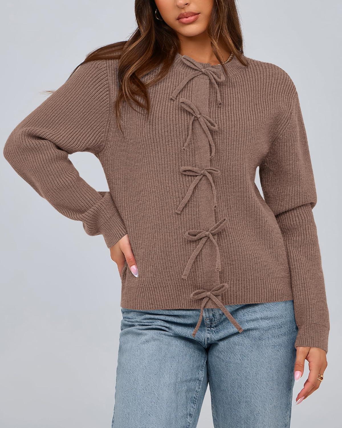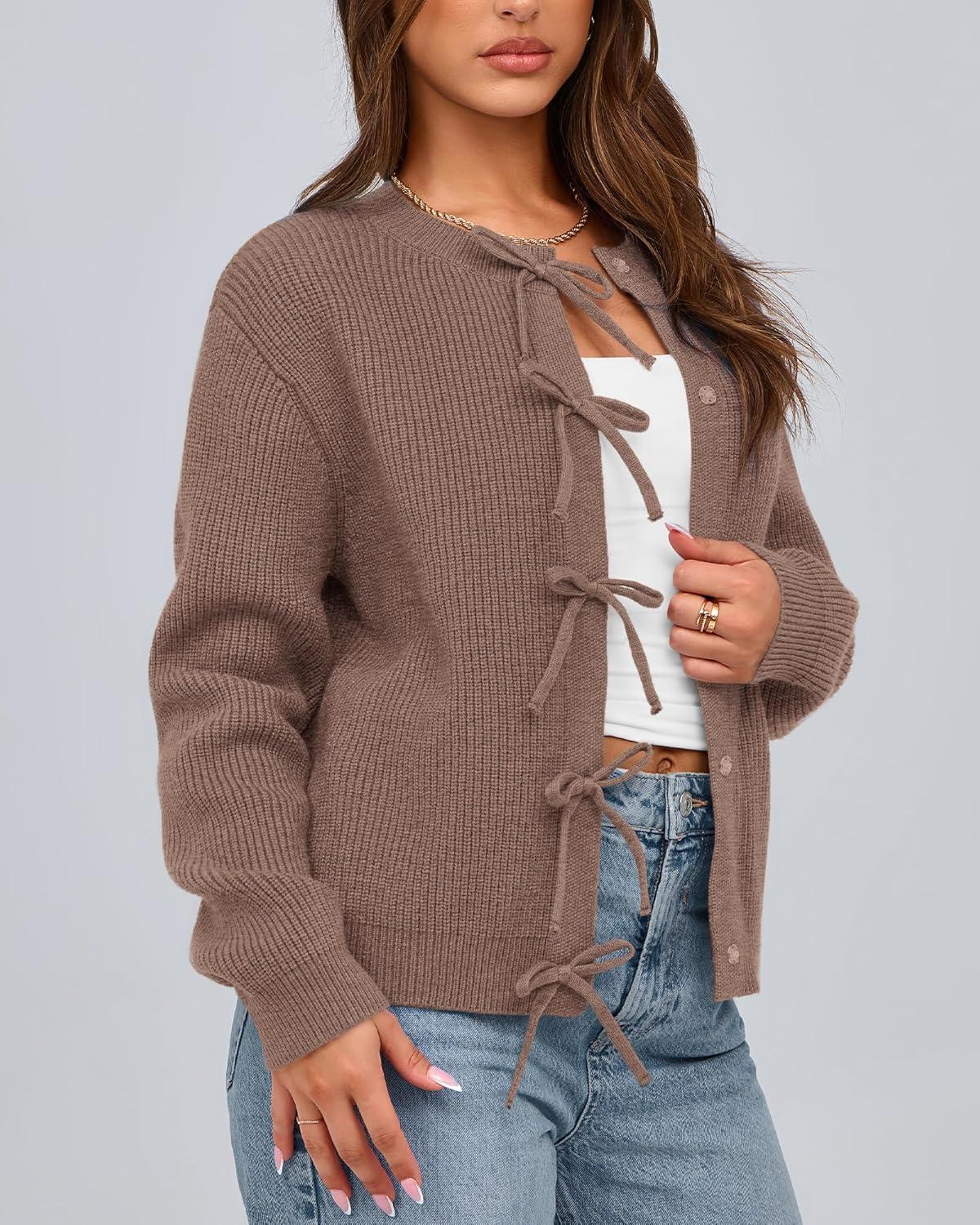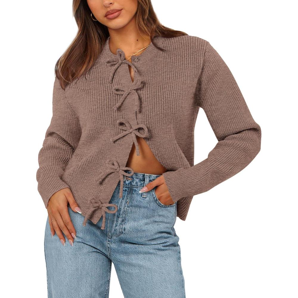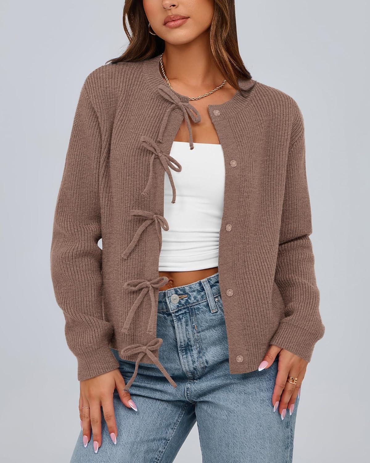 BTFBM Bow Cardigan Sweaters for Women Trendy 2025 Fall Winter Open Front Long Sleeve Button Down Cropped Lady Jacket(Brown)