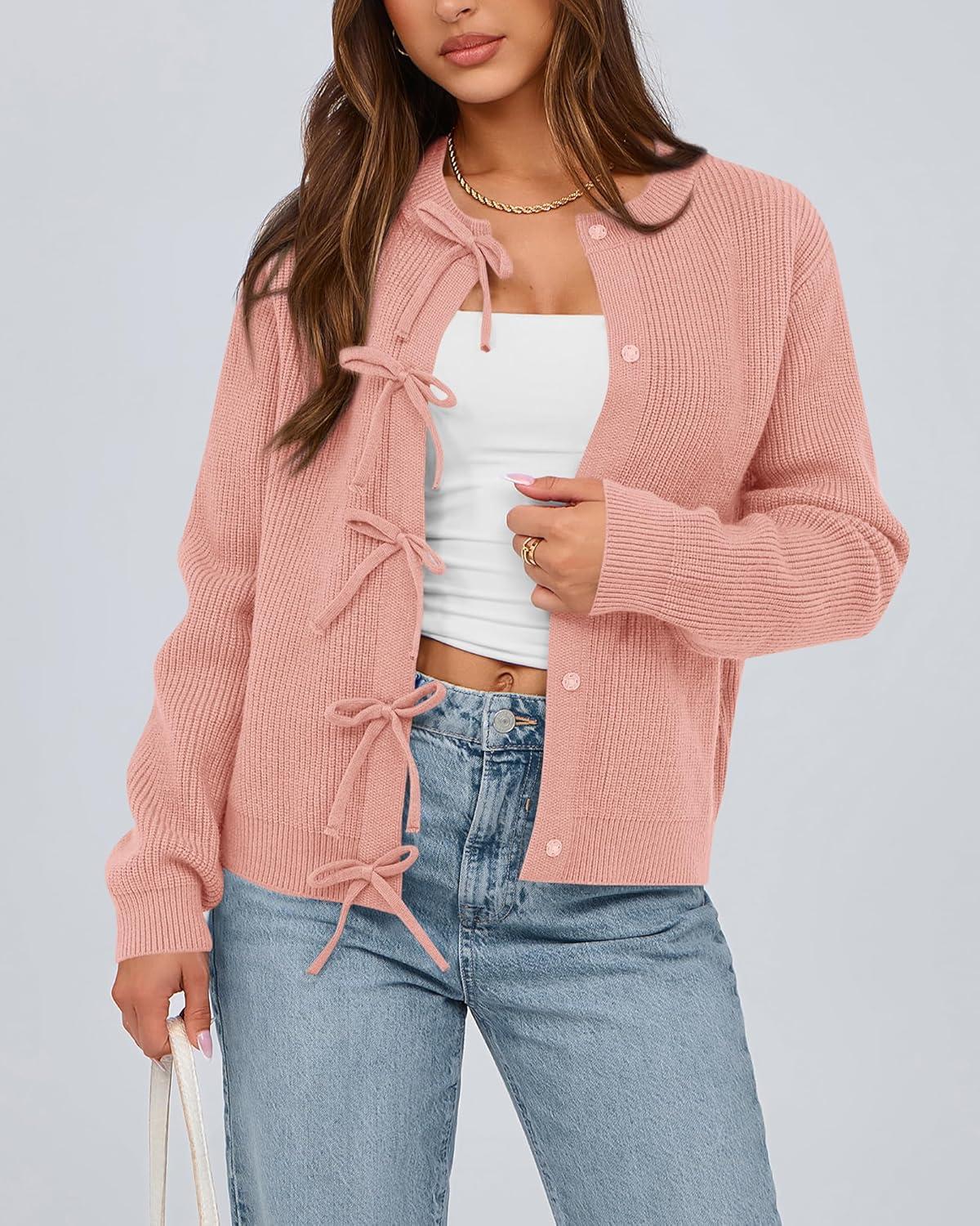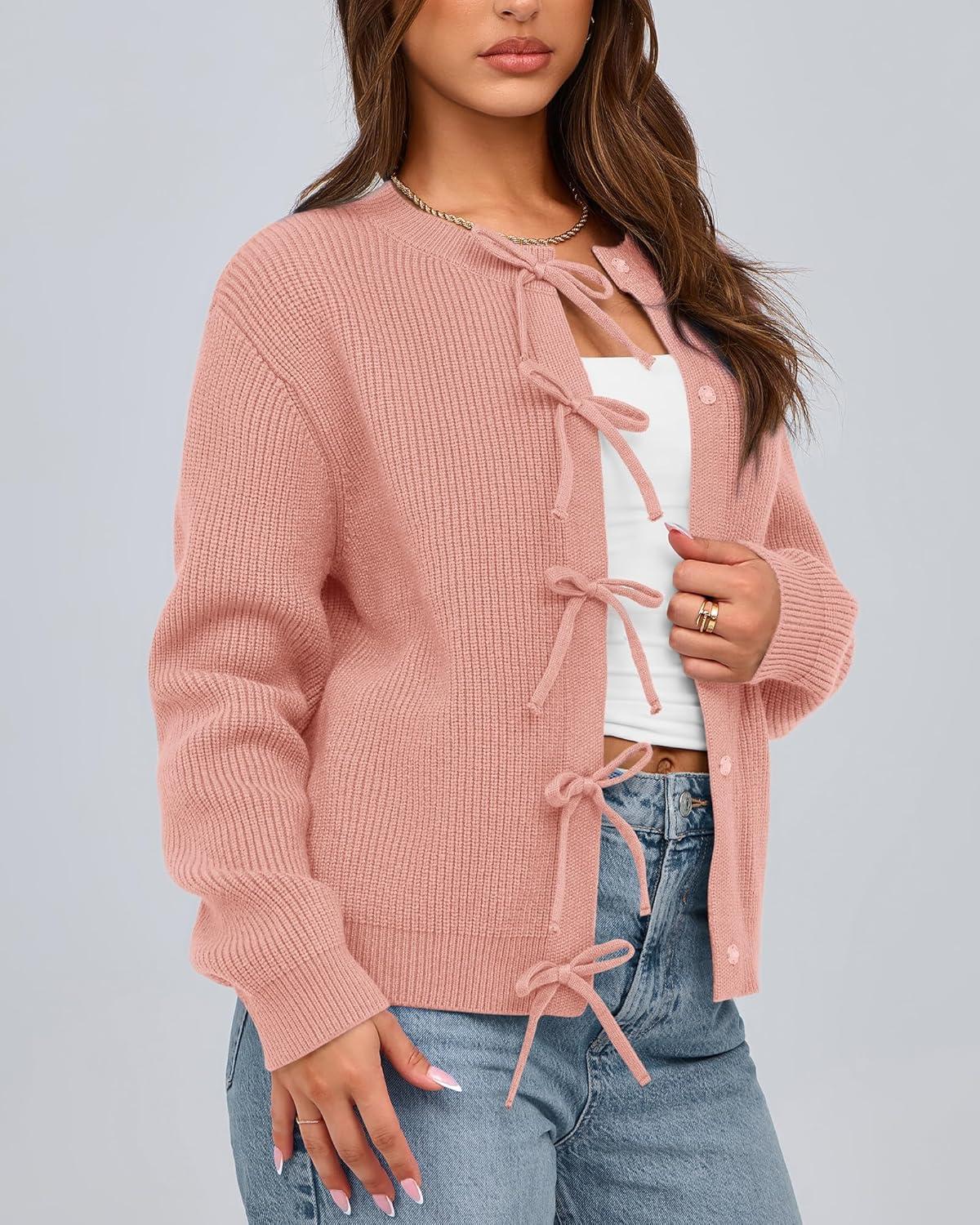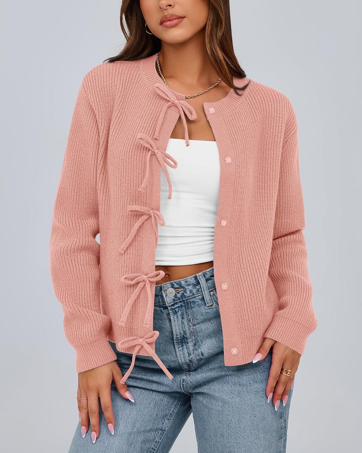 BTFBM Bow Cardigan Sweaters for Women Trendy 2025 Fall Winter Open Front Long Sleeve Button Down Cropped Lady Jacket(Pink)