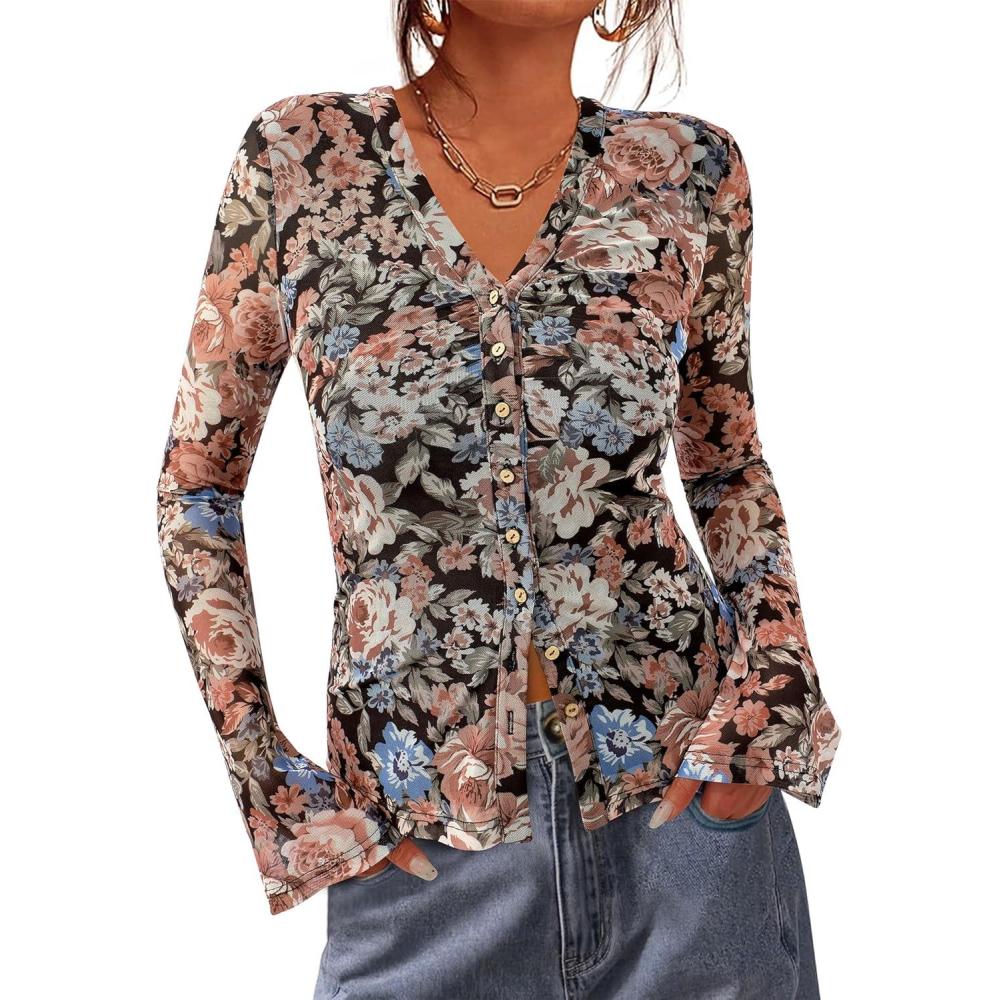 BTFBM Button Down Shirts for Women 2026 Spring Boho Tops V Neck Long Sleeve Blouses Ruched Mesh Fitted Fall Fashion(Floral Black Orange)