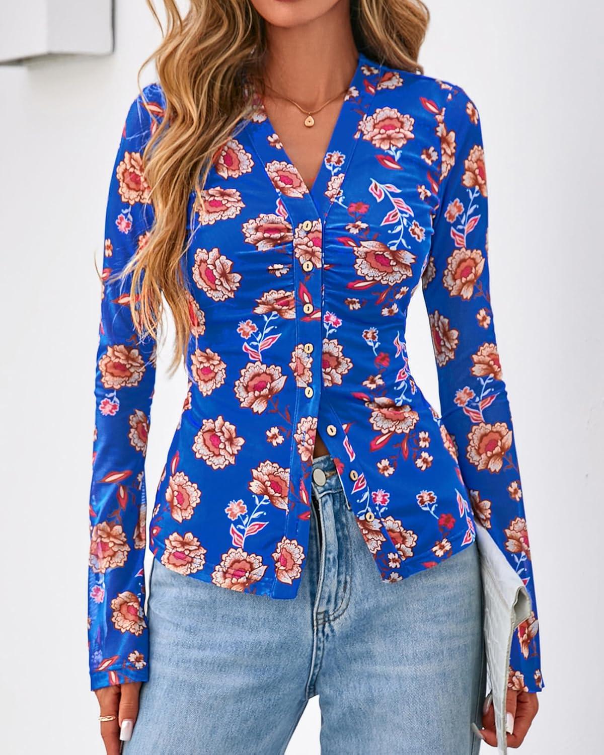 BTFBM Button Down Shirts for Women Fall Fashion 2025 V Neck Long Sleeve Blouse Ruched Mesh Fitted Floral Print Boho Tops(Royal Blue)