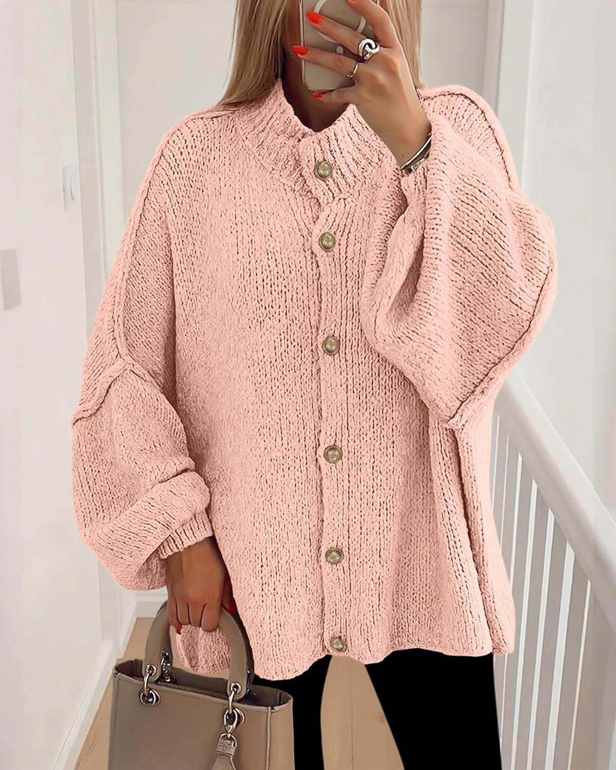 BTFBM Cardigan Sweaters for Women 2025 Fall Clothes Lantern Long Sleeve Button Open Front Chunky Knit Oversized Sweater(Pink)