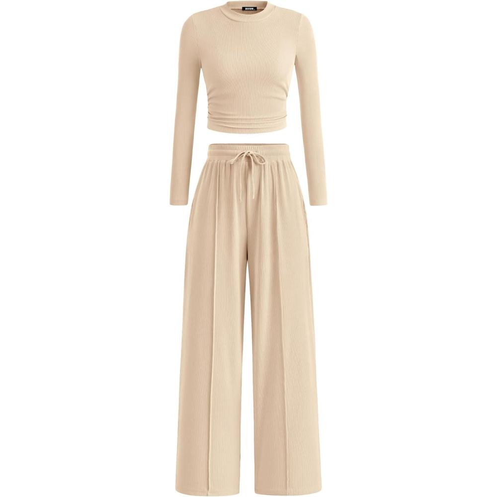 BTFBM Casual 2 Piece Sets For Women Fall Outfits 2025 Ribbed Long Sleeve Crop Top Wide Leg Pants Matching Lounge Set(Beige)