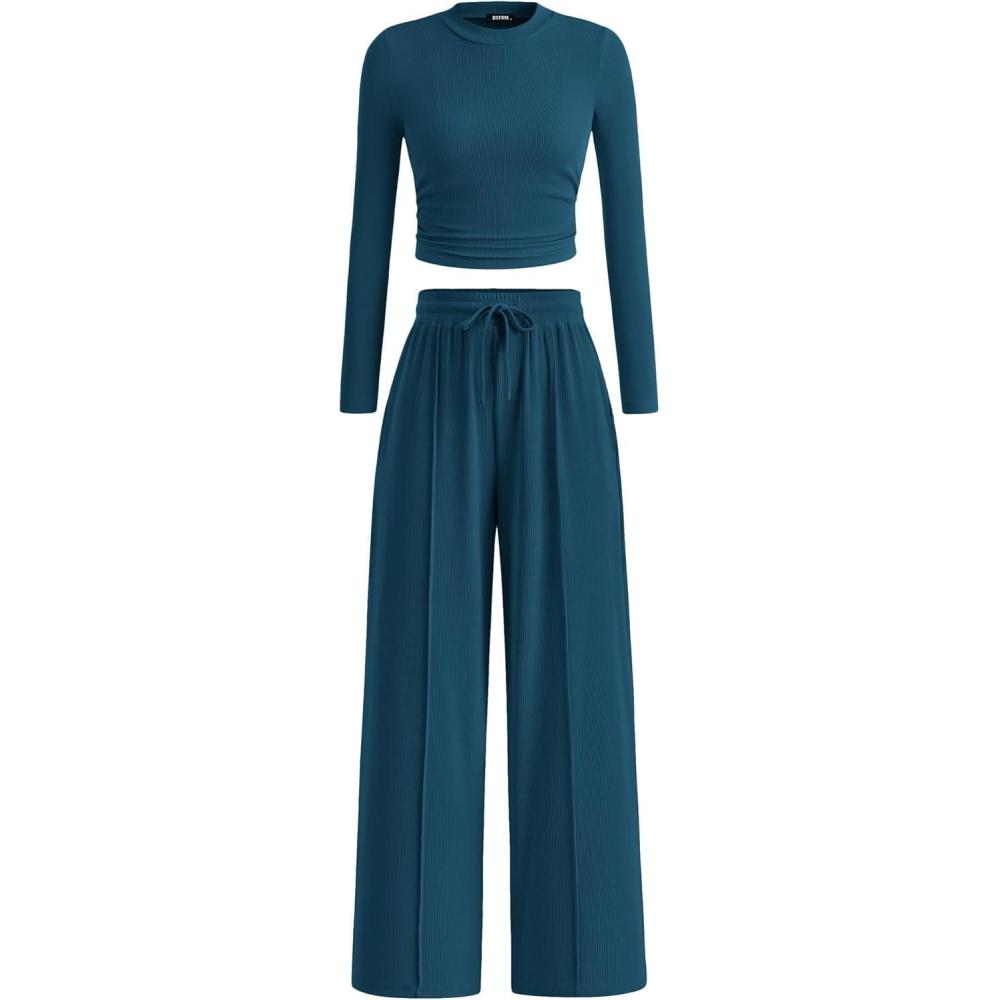 Save up to 40% on BTFBM Casual 2 Piece Sets For Women Fall Outfits 2025 Ribbed Long Sleeve Crop Top Wide Leg Pants Matching Lounge Set(Lake Blue) styles during our end-of-season sale.