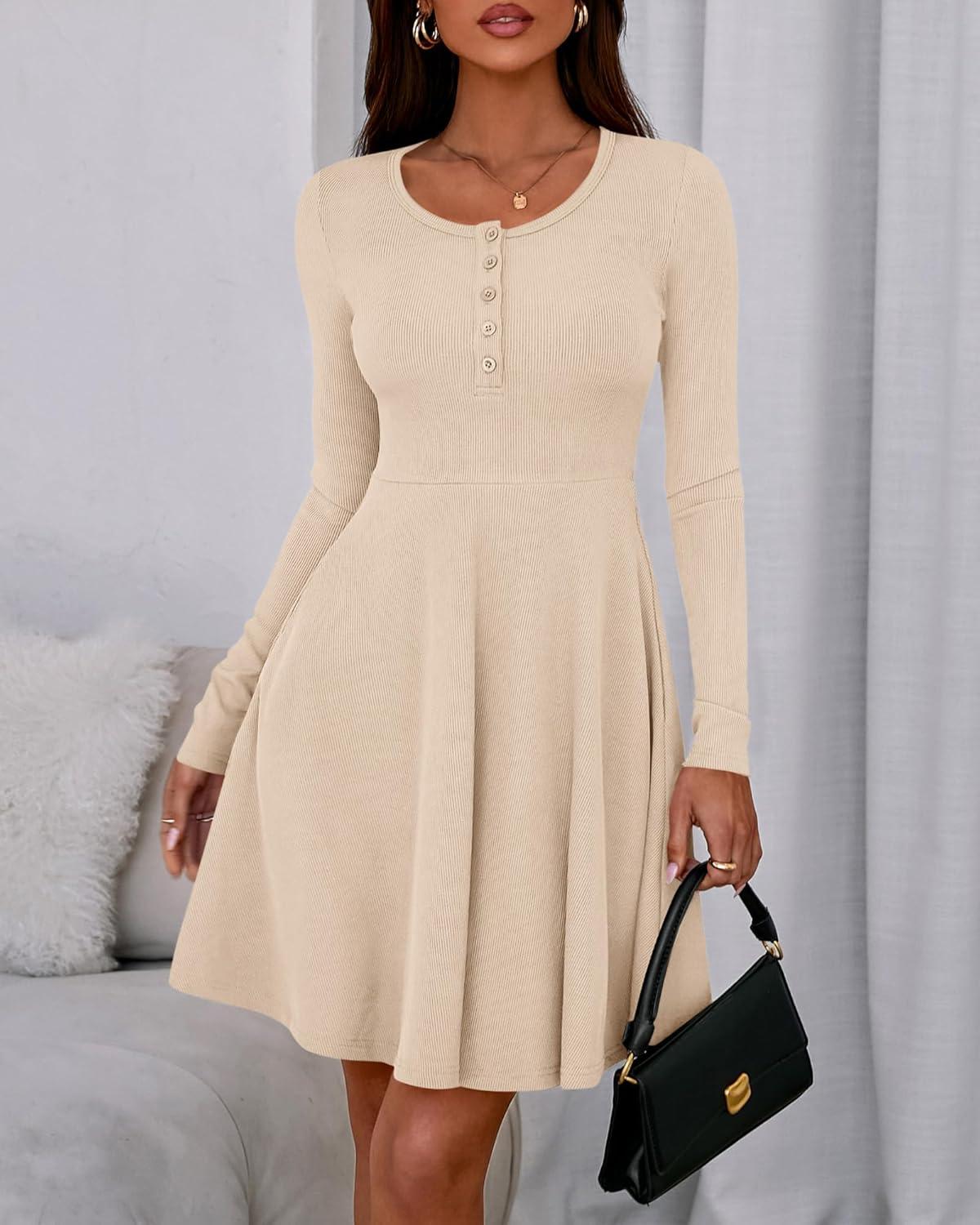 BTFBM Casual Fall Dresses for Women 2025 Long Sleeve Ribbed Button Down Empire Waist A Line Winter Wedding Guest Dress(Beige)