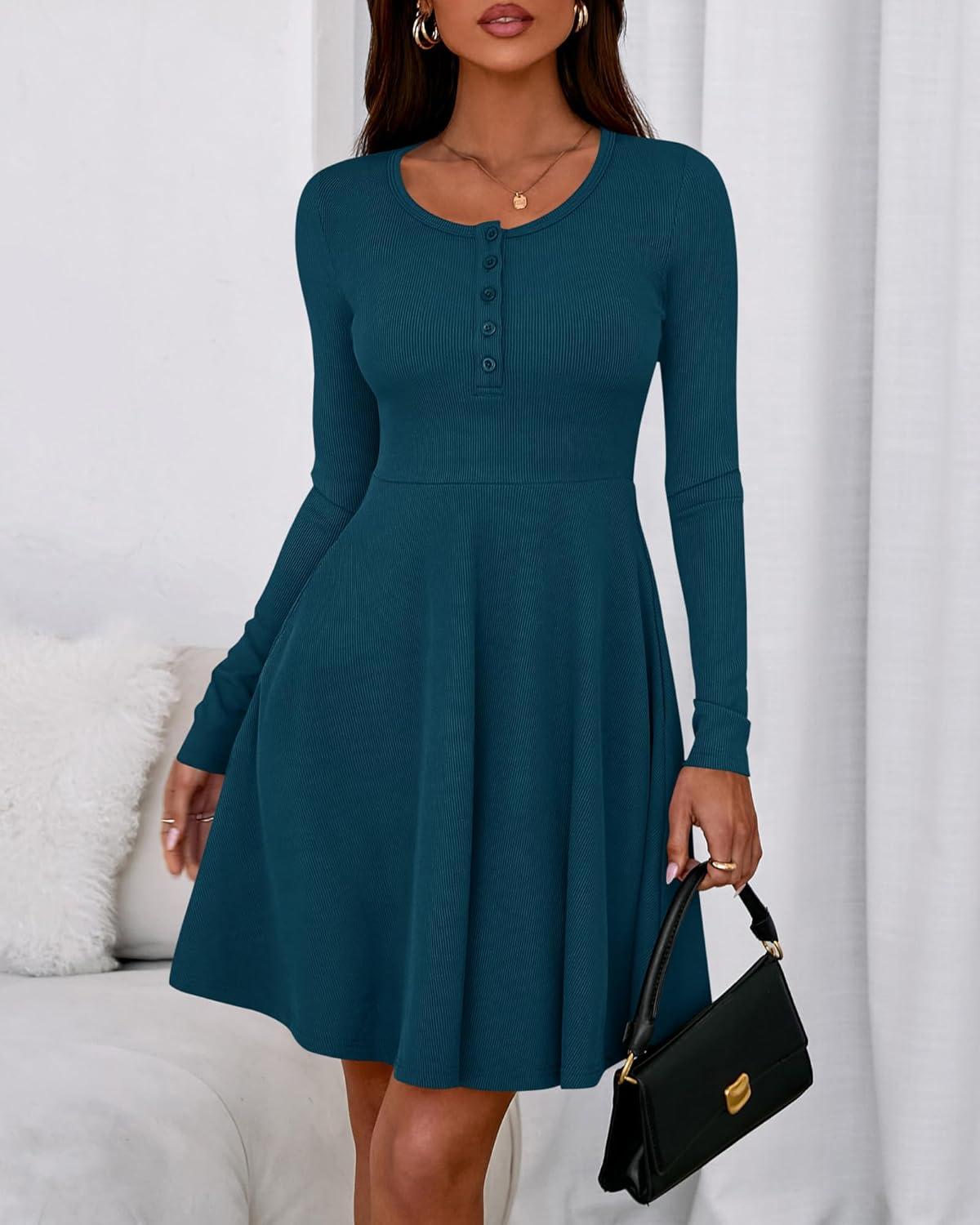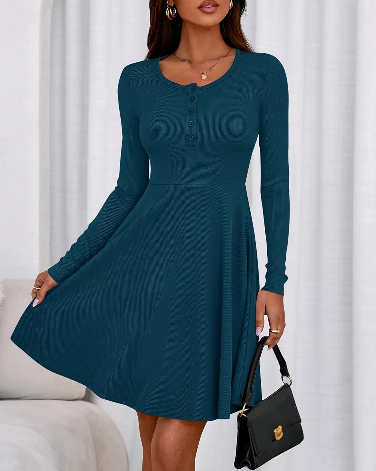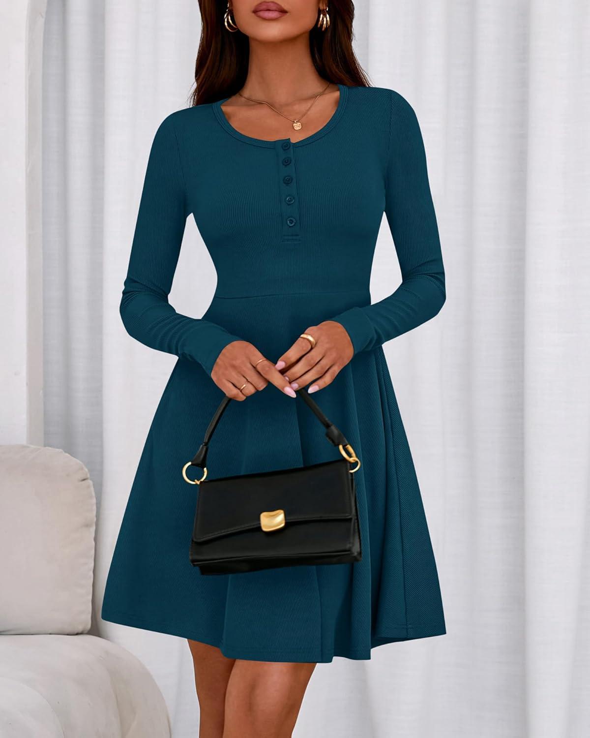 BTFBM Casual Fall Dresses for Women 2025 Long Sleeve Ribbed Button Down Empire Waist A Line Winter Wedding Guest Dress(Lake Blue)