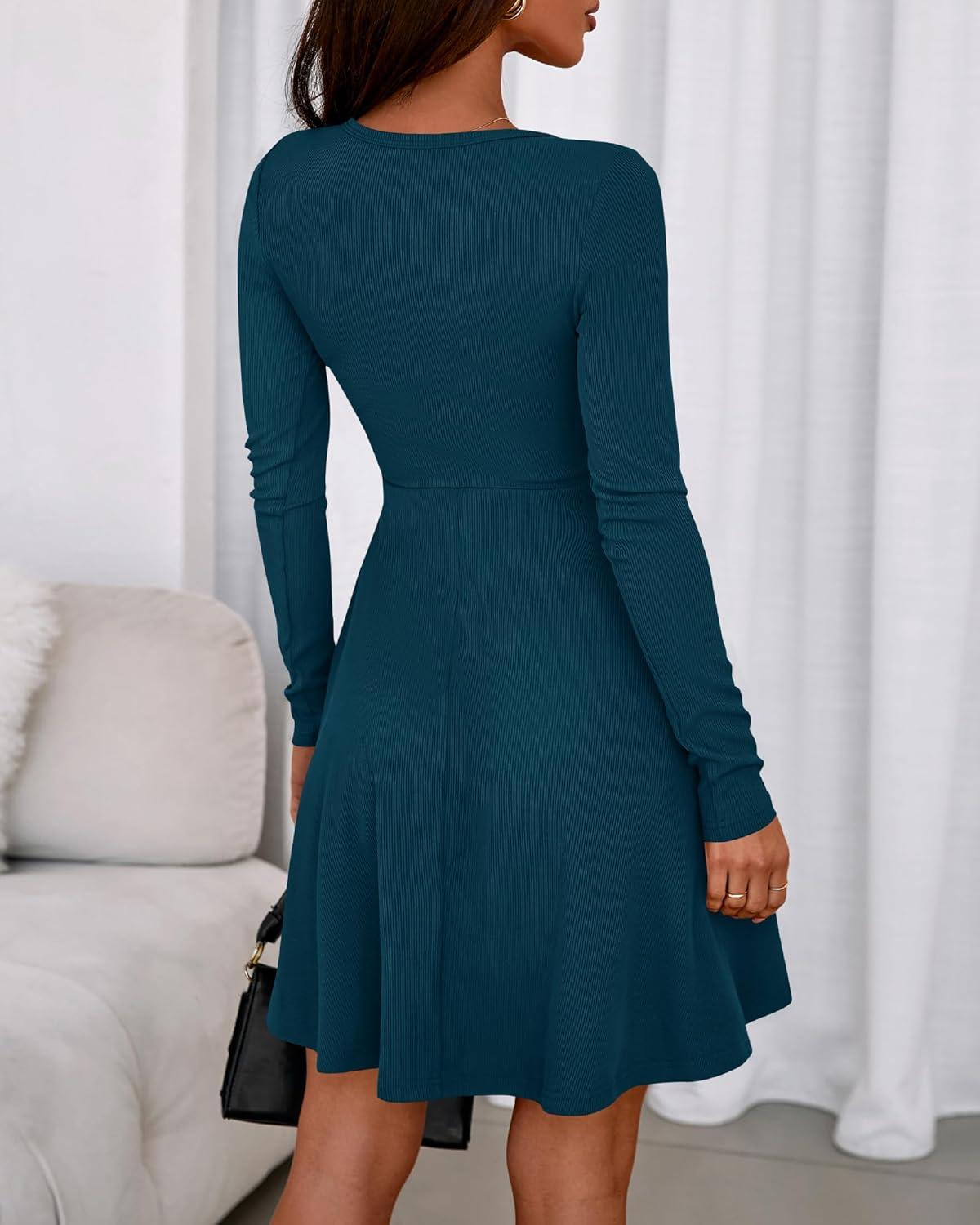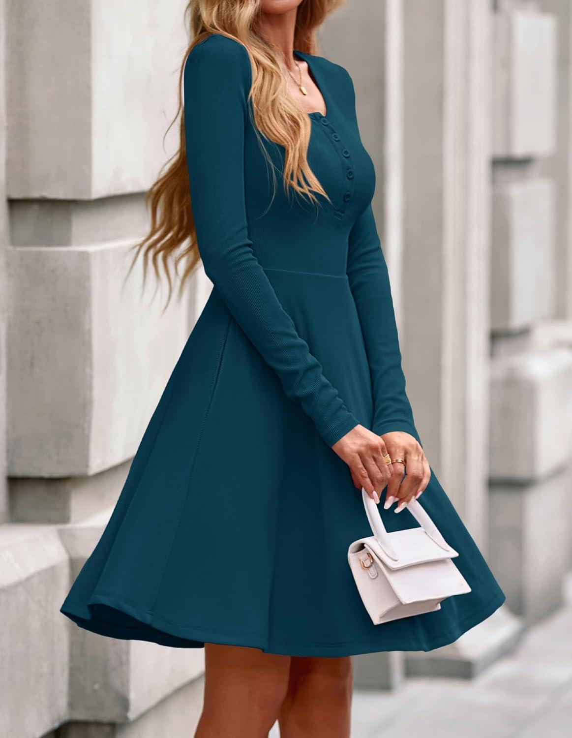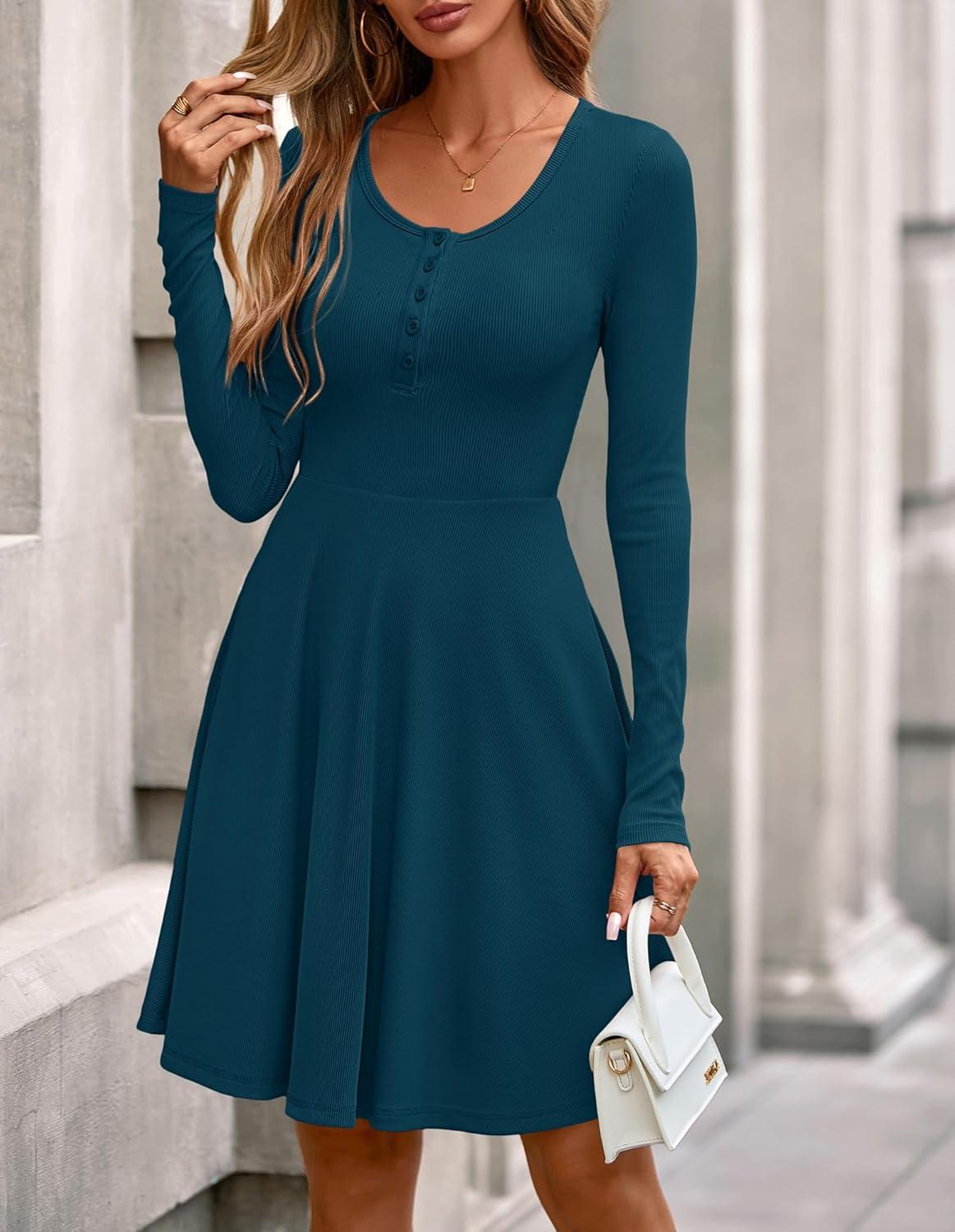 BTFBM Casual Fall Dresses for Women 2025 Long Sleeve Ribbed Button Down Empire Waist A Line Winter Wedding Guest Dress(Lake Blue)