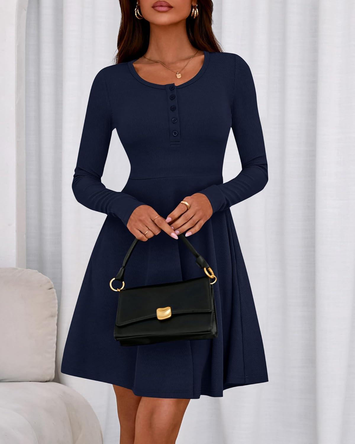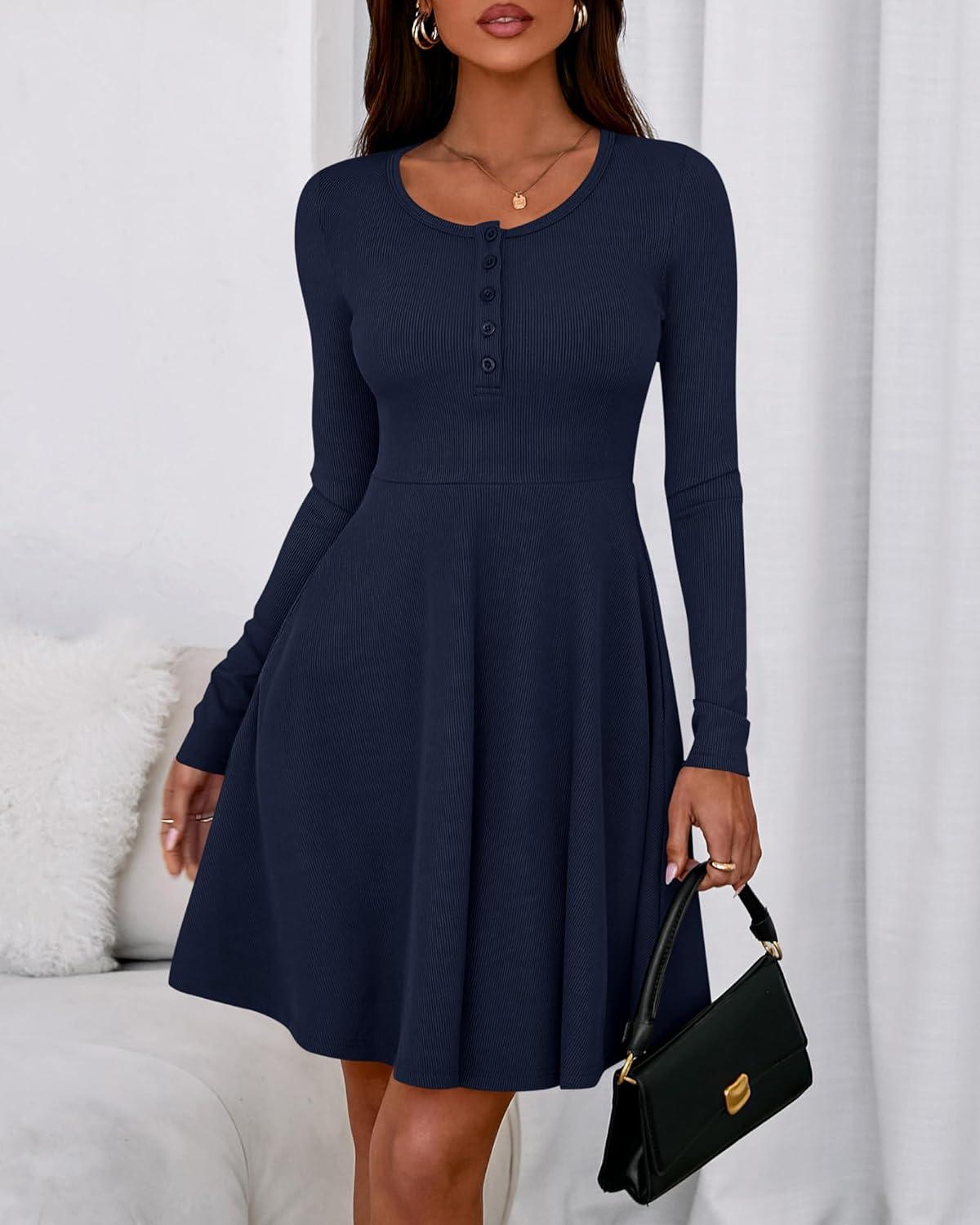 BTFBM Casual Fall Dresses for Women 2025 Long Sleeve Ribbed Button Down Empire Waist A Line Winter Wedding Guest Dress(Navy)
