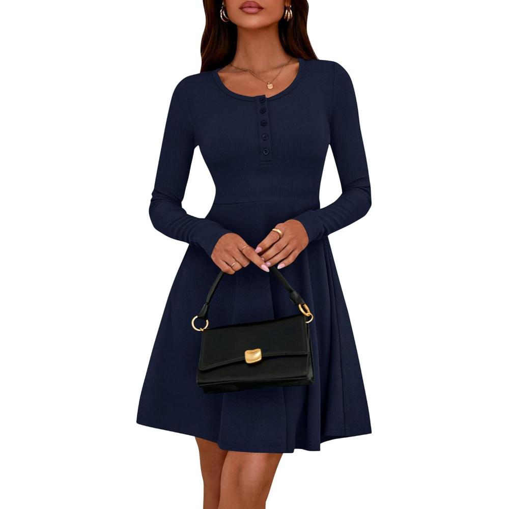 Get the BTFBM Casual Fall Dresses for Women 2025 Long Sleeve Ribbed Button Down Empire Waist A Line Winter Wedding Guest Dress(Navy) you’ve been eyeing at a discounted price during our seasonal sale event.