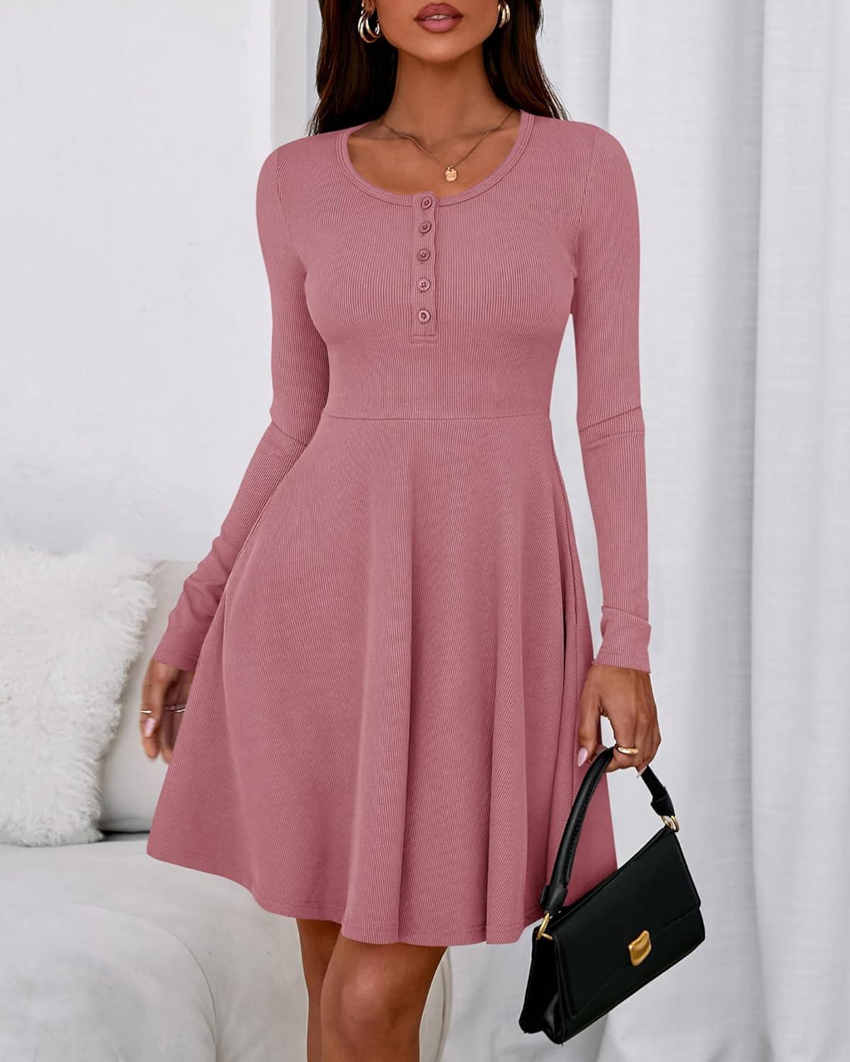BTFBM Casual Fall Dresses for Women 2025 Long Sleeve Ribbed Button Down Empire Waist A Line Winter Wedding Guest Dress(Pink)