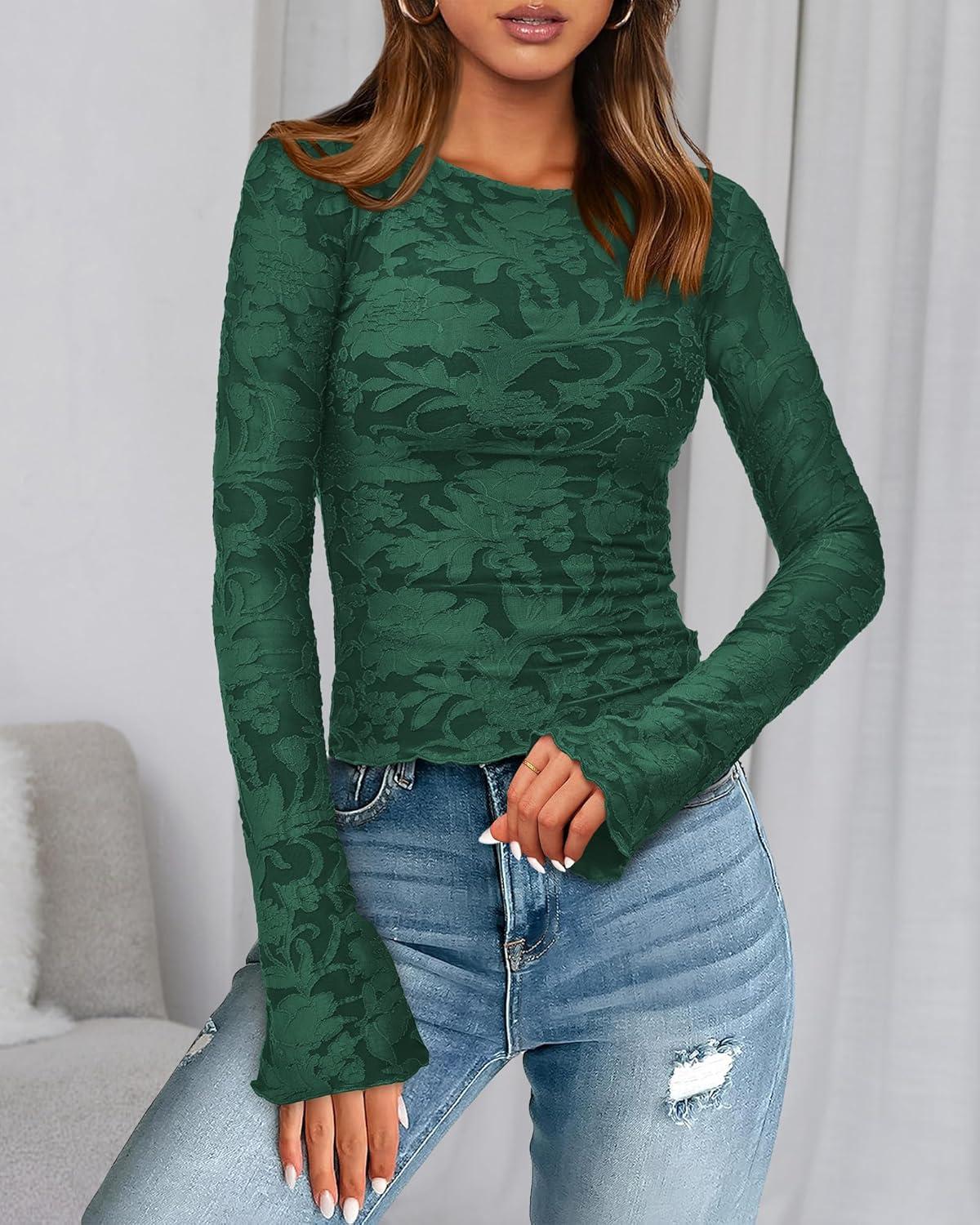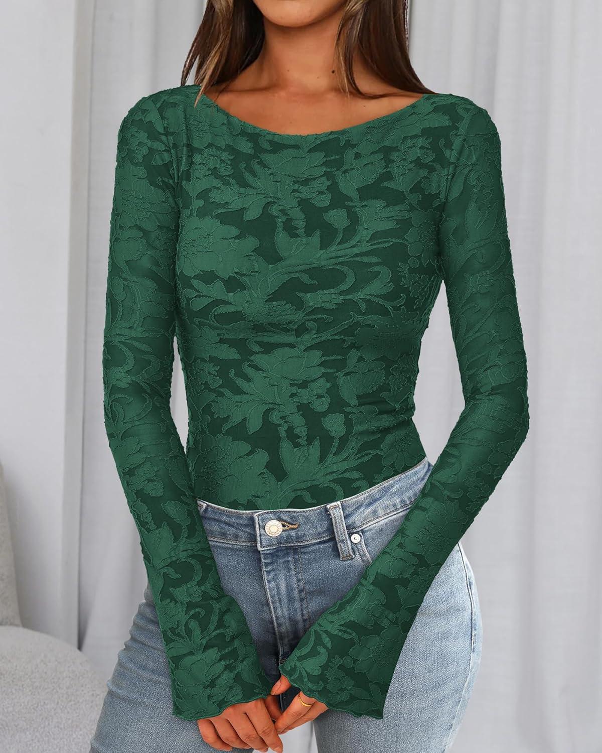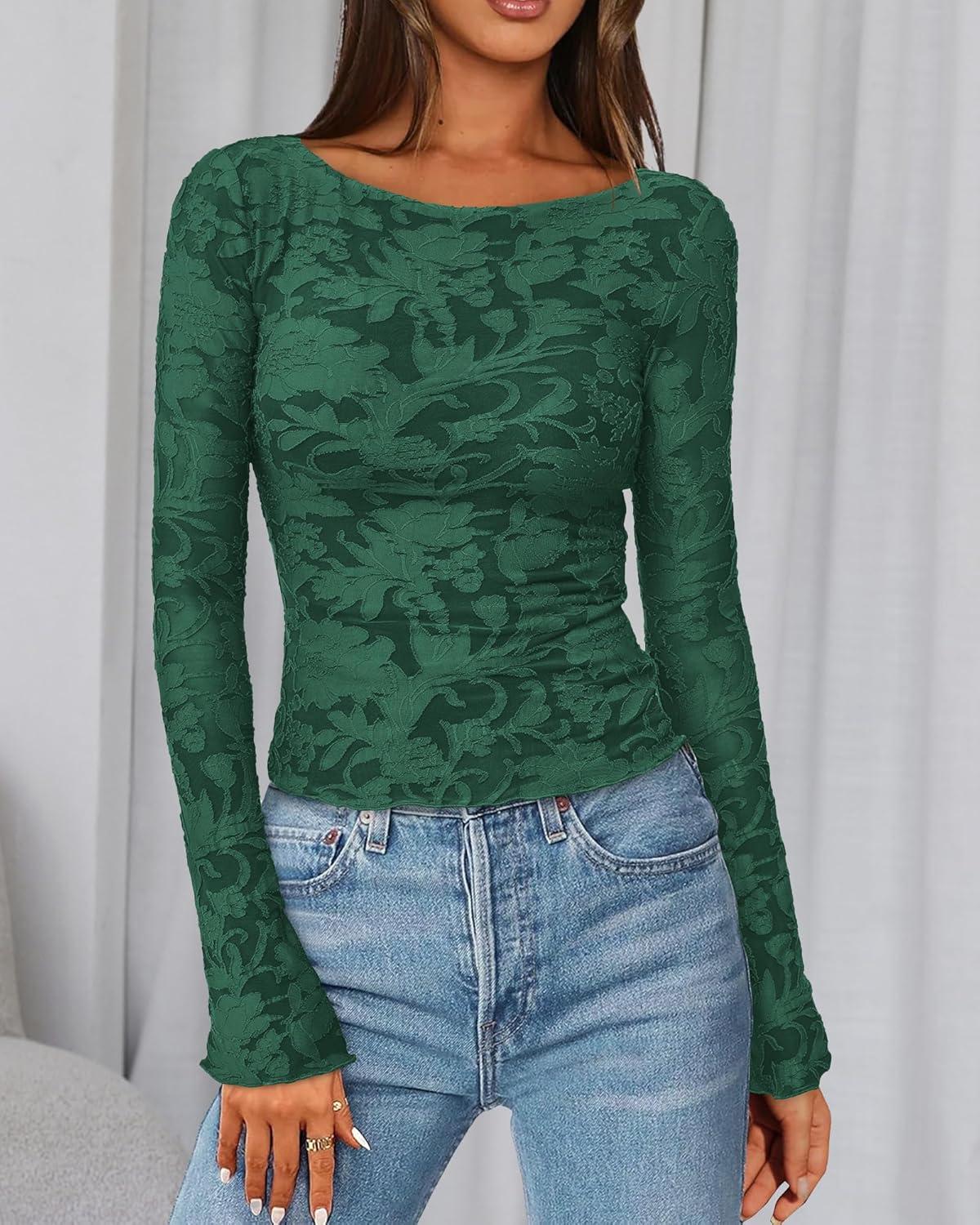 BTFBM Casual Long Sleeve Shirts Fall 2025 Going Out Tops for Women Trendy Floral Work Blouses Bodycon Tunics(Dark Green)