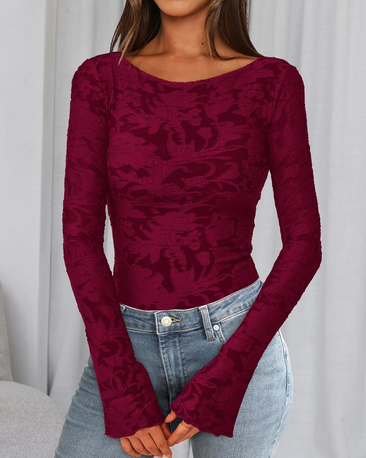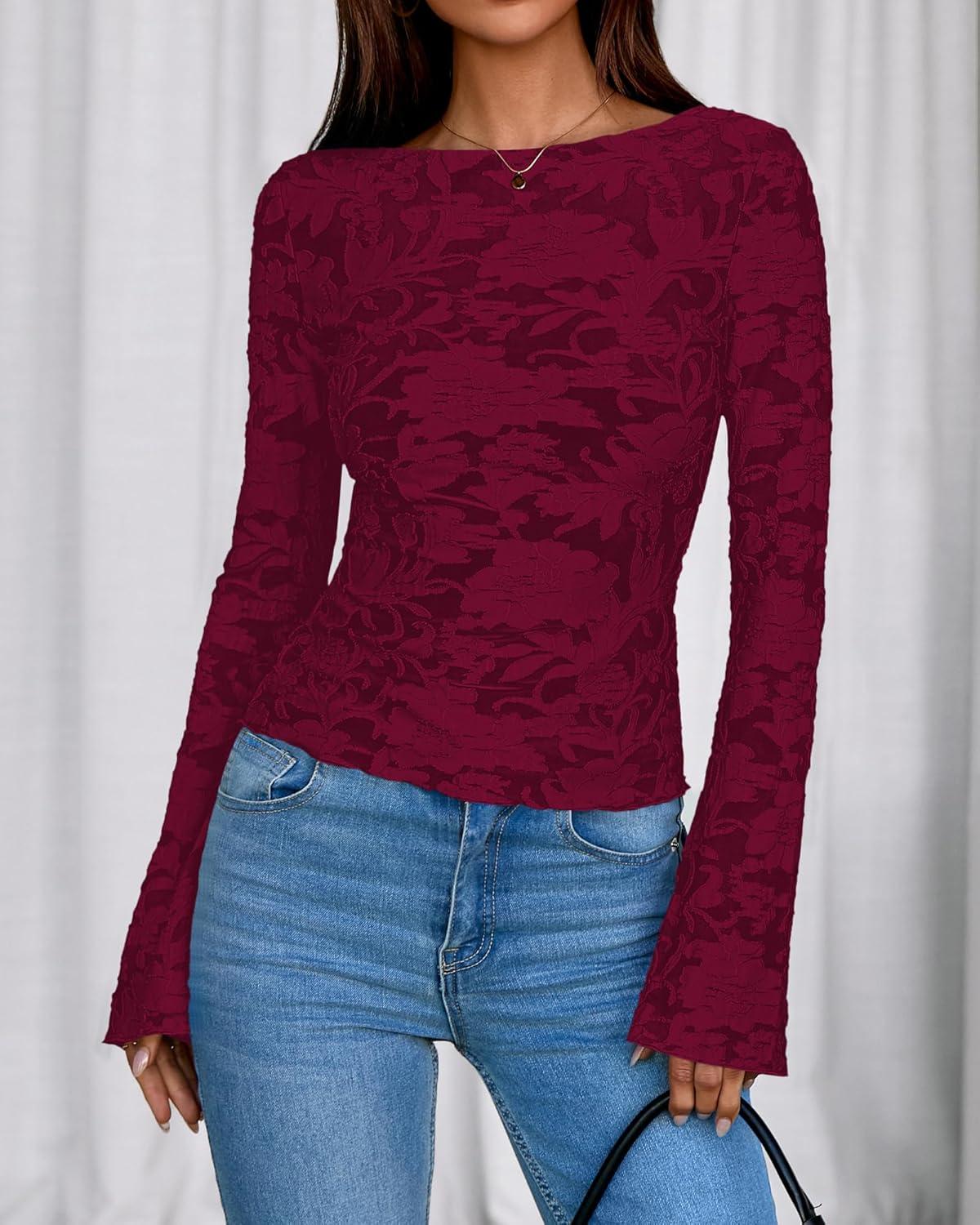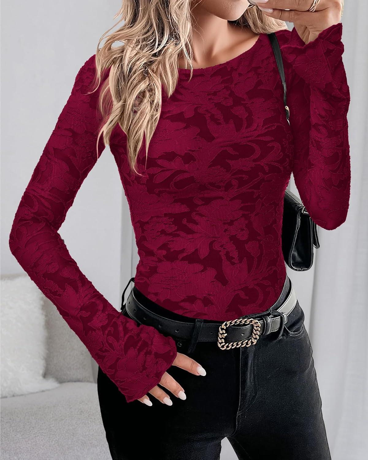 BTFBM Casual Long Sleeve Shirts Fall 2025 Going Out Tops for Women Trendy Floral Work Blouses Bodycon Tunics(Wine Red)