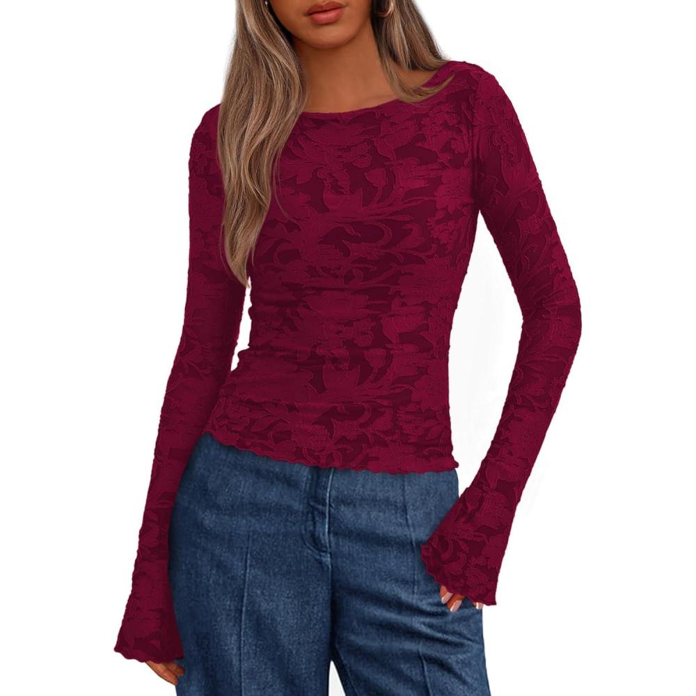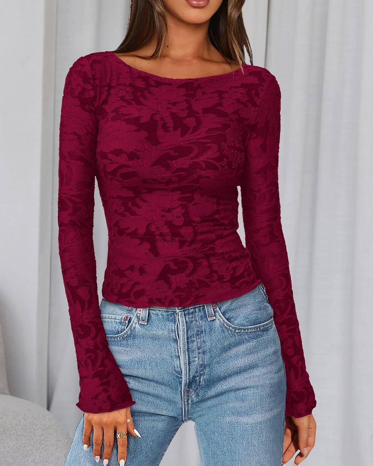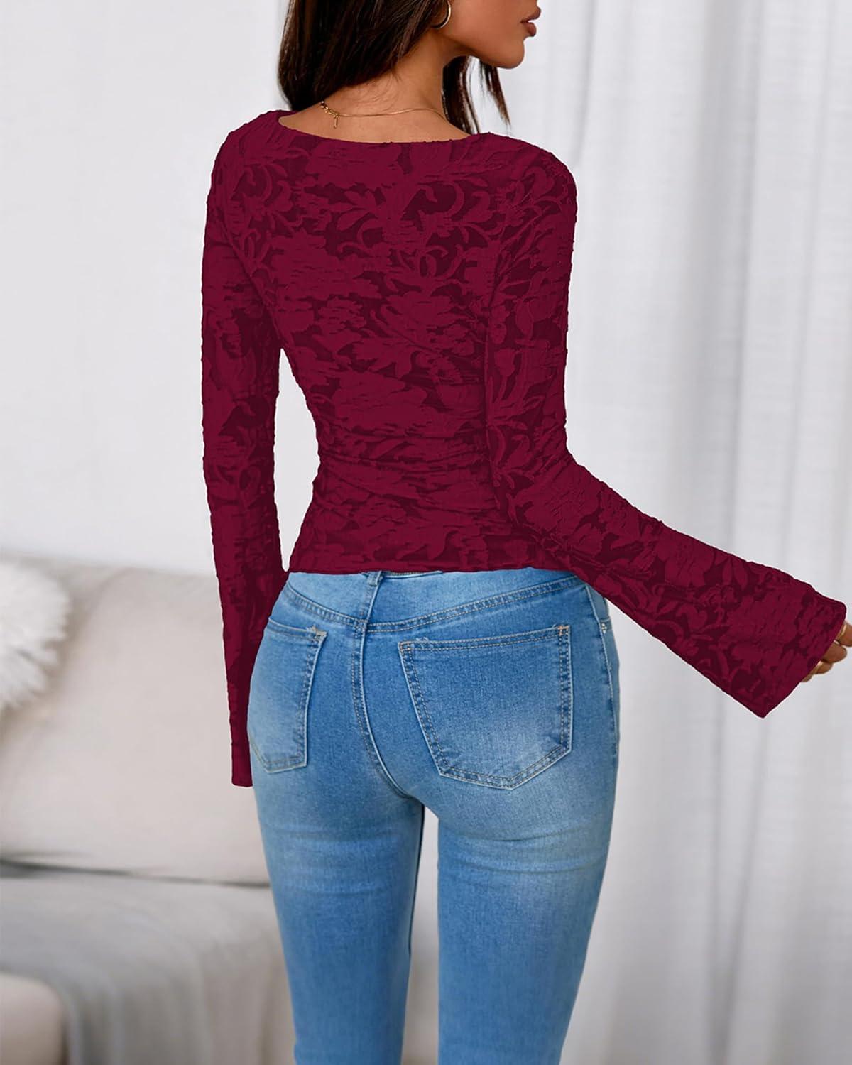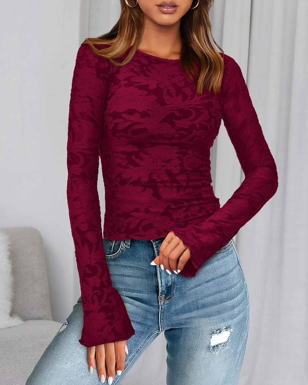BTFBM Casual Long Sleeve Shirts Fall 2025 Going Out Tops for Women Trendy Floral Work Blouses Bodycon Tunics(Wine Red)