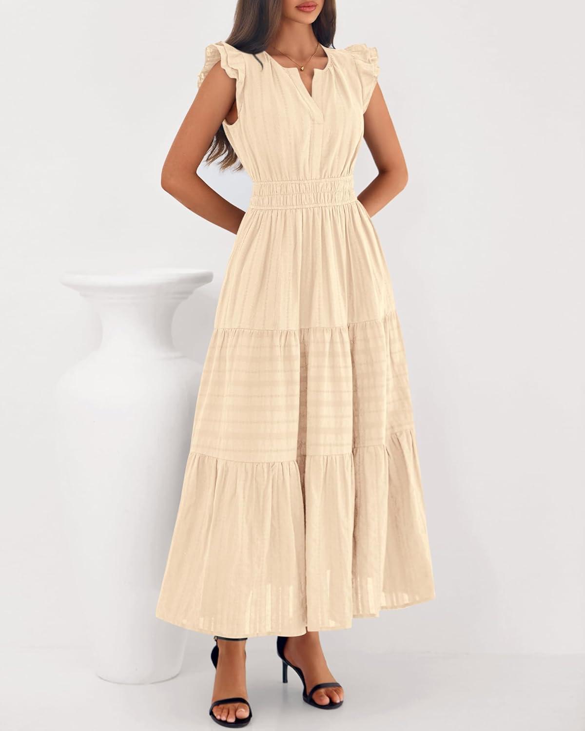 BTFBM Dresses for Women Spring 2026 Maxi Casual Dress Flutter Short Sleeve V Neck Elastic Waist Boho Beach Vacation Pockets(Apricot)