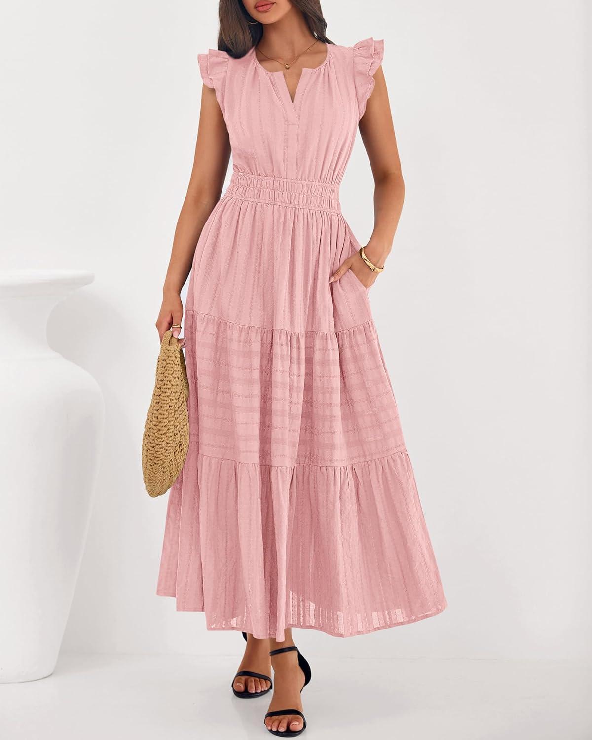 BTFBM Dresses for Women Spring 2026 Maxi Casual Dress Flutter Short Sleeve V Neck Elastic Waist Boho Beach Vacation Pockets(Pink)