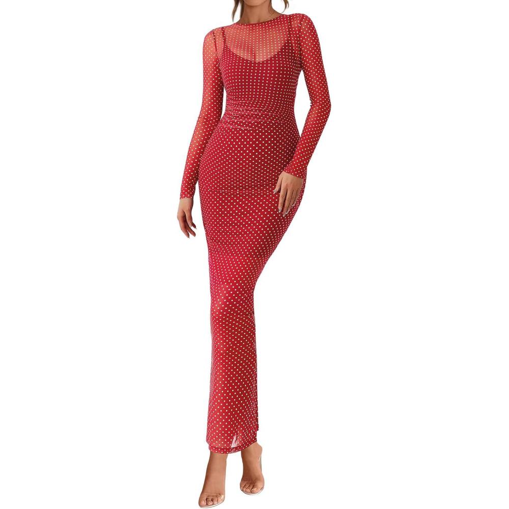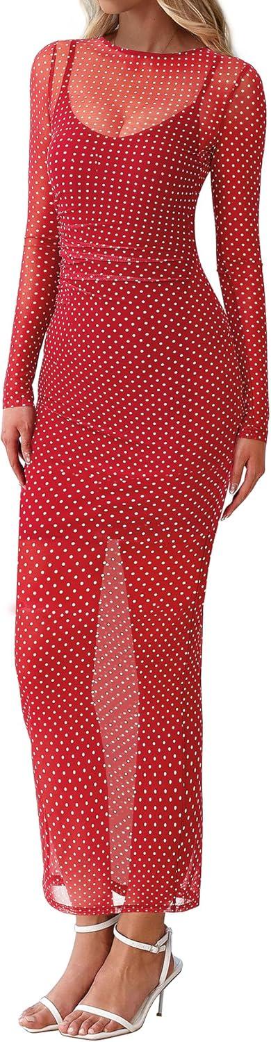 BTFBM Fall Dresses for Women 2025 2 Piece Set Long Sleeve Polka Dot Sexy Bodycon Mesh Dress and Slip Dress Party Wedding(Small Dot Red White)