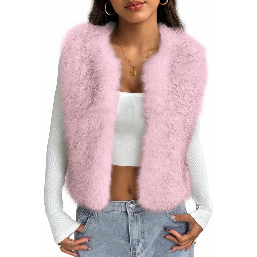 BTFBM Faux Fur Vest For Women 2025 Trendy Fall Sleeveless Cropped Fuzzy Jacket Fluffy Winter Coats Furry Vests Outerwear(Pink)