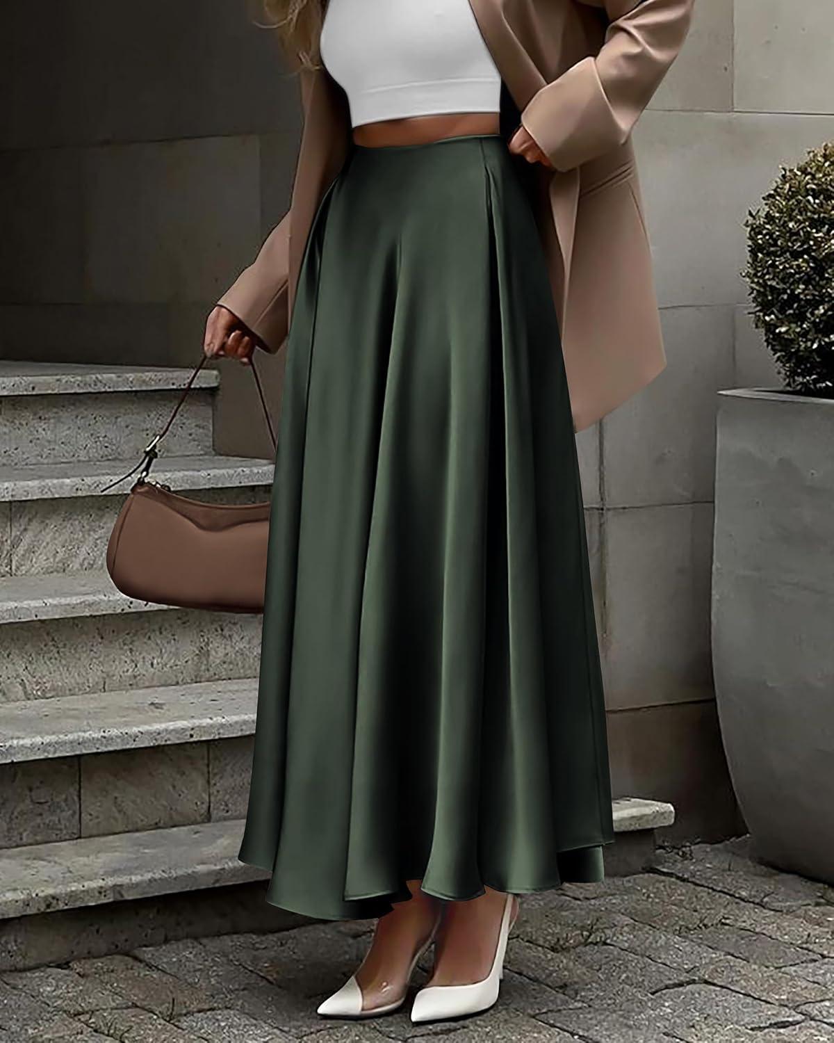 BTFBM High Waisted Skirts for Women Fall Clothes 2025 Elegant Satin Flowy A-Line Cocktail Formal Night Out Maxi Skirt(Dark Army Green)