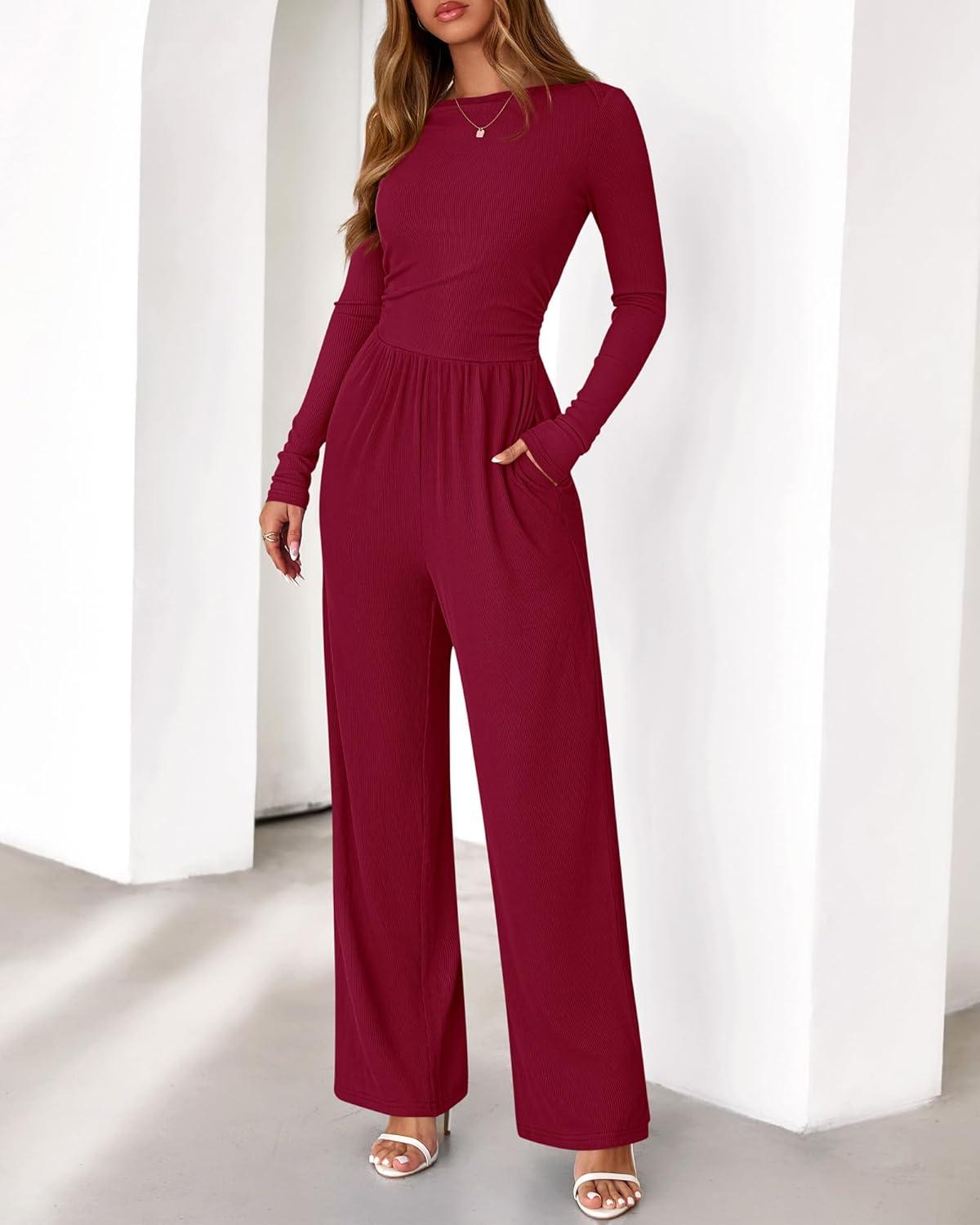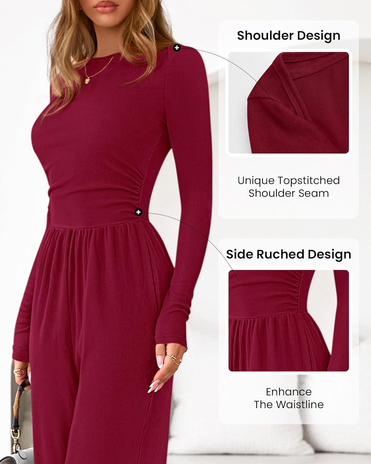 BTFBM Jumpsuits For Women Dressy 2025 Fall Casual One Piece Outfits Pocket Long Sleeve Knit Ruched Wide Leg Pants Romper(Dark Red)