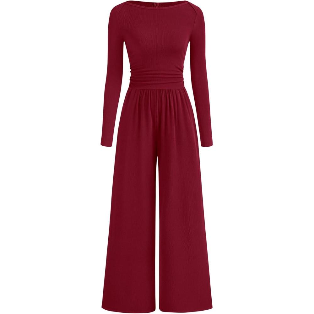 imageBTFBM Jumpsuits For Women Dressy 2025 Fall Casual One Piece Outfits Pocket Long Sleeve Knit Ruched Wide Leg Pants RomperDark Red