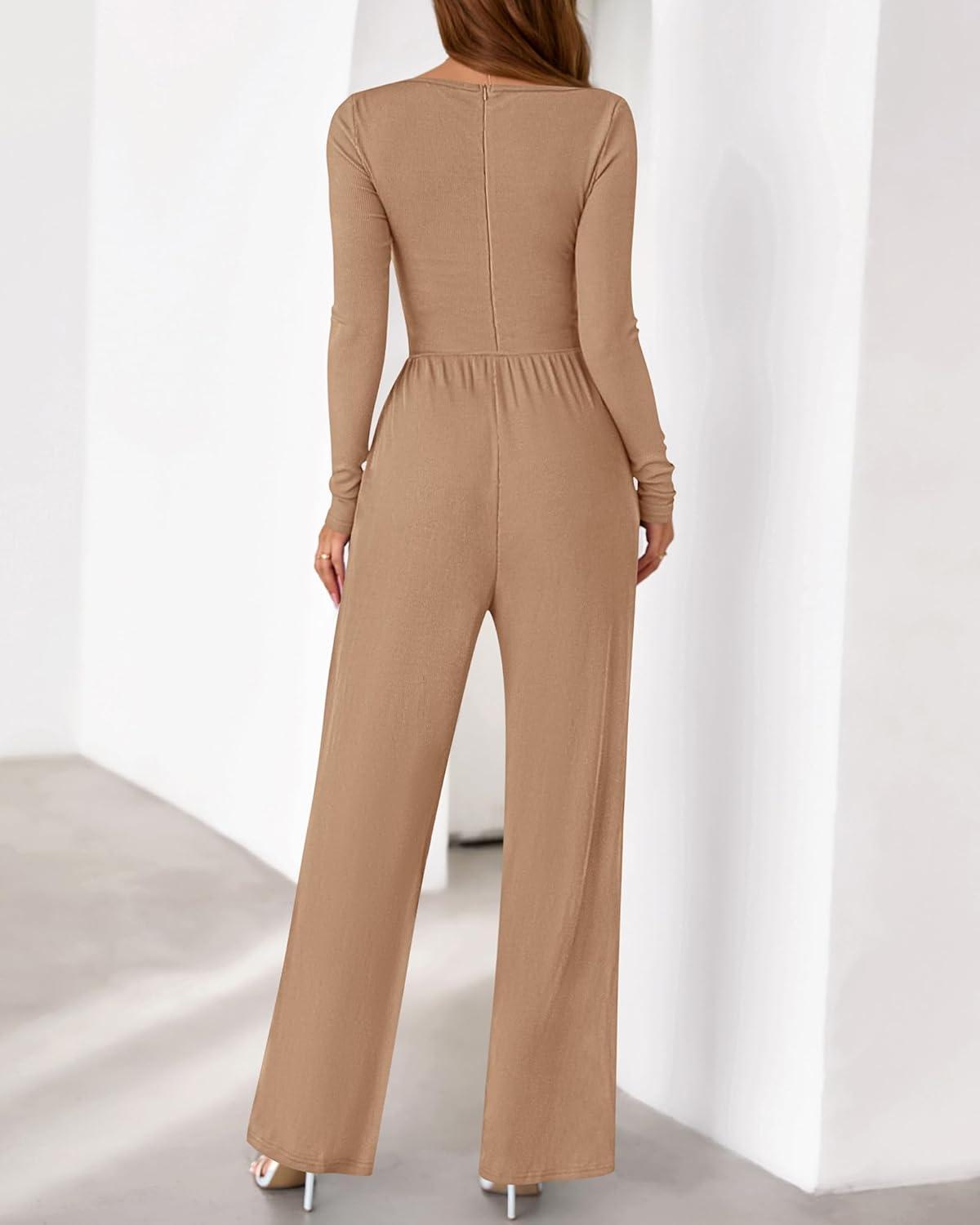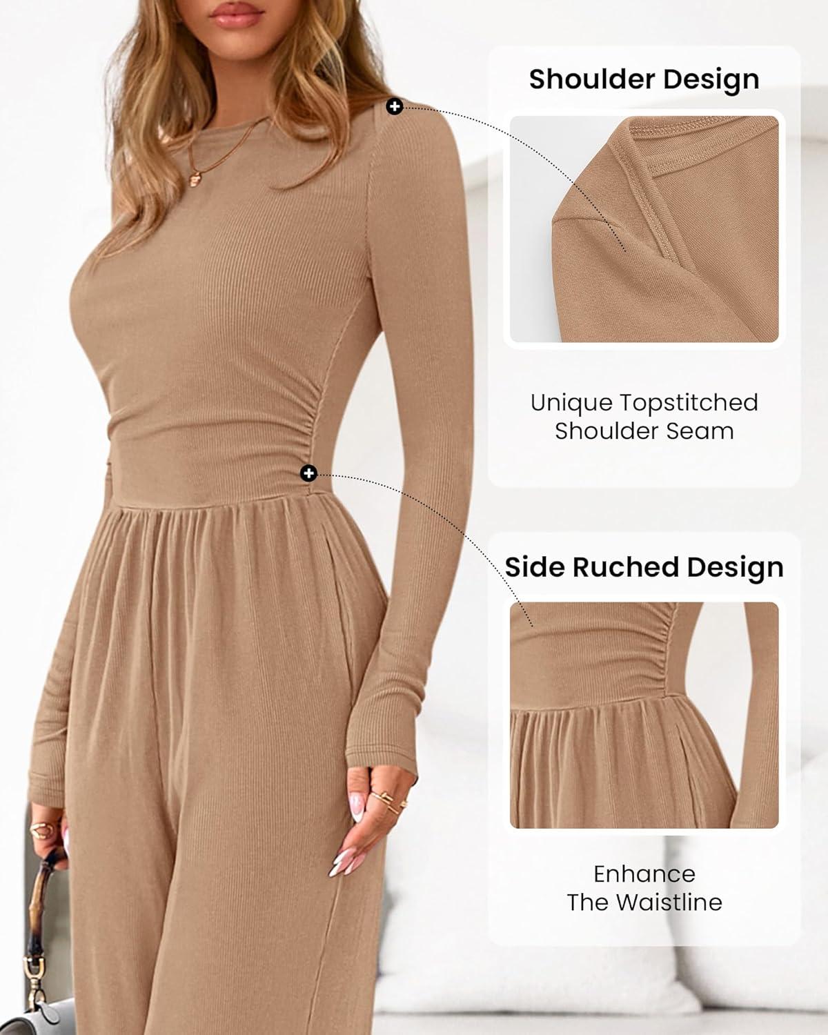 BTFBM Jumpsuits For Women Dressy 2025 Fall Casual One Piece Outfits Pocket Long Sleeve Knit Ruched Wide Leg Pants Romper(Khaki)