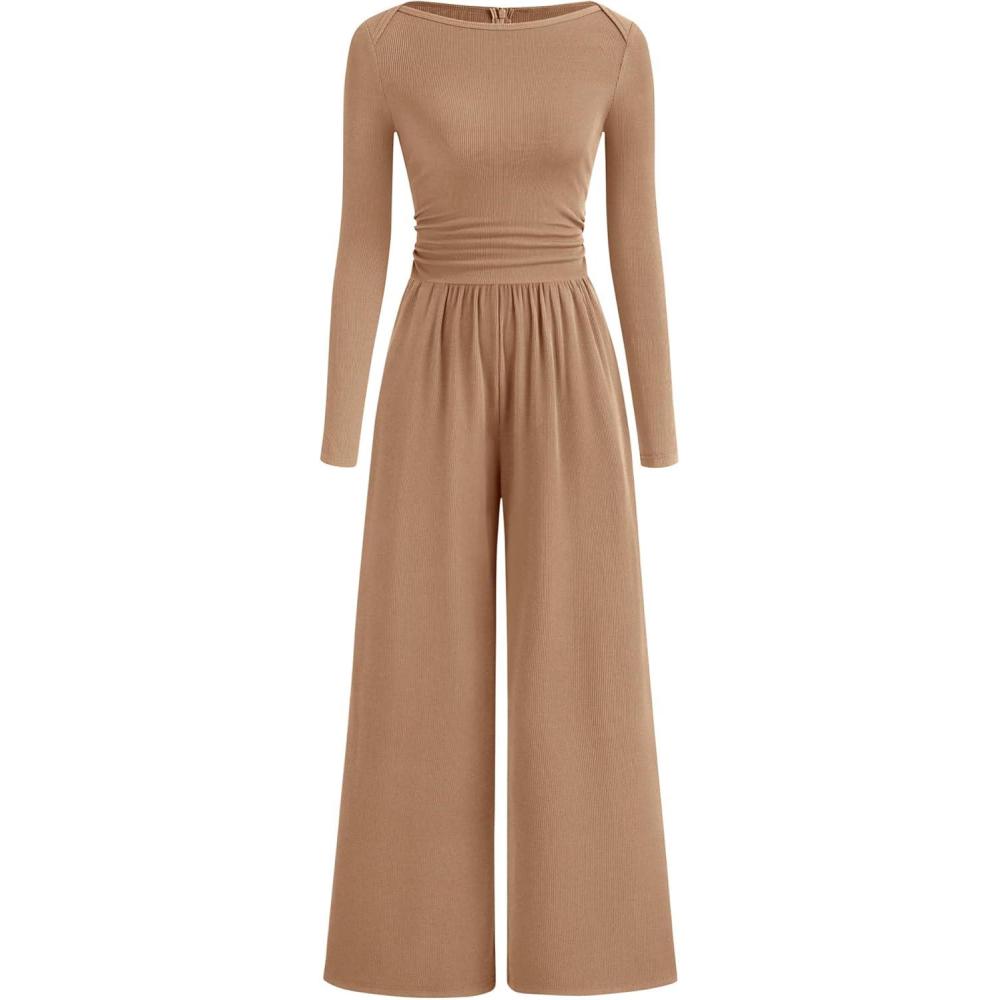 imageBTFBM Jumpsuits For Women Dressy 2025 Fall Casual One Piece Outfits Pocket Long Sleeve Knit Ruched Wide Leg Pants RomperKhaki