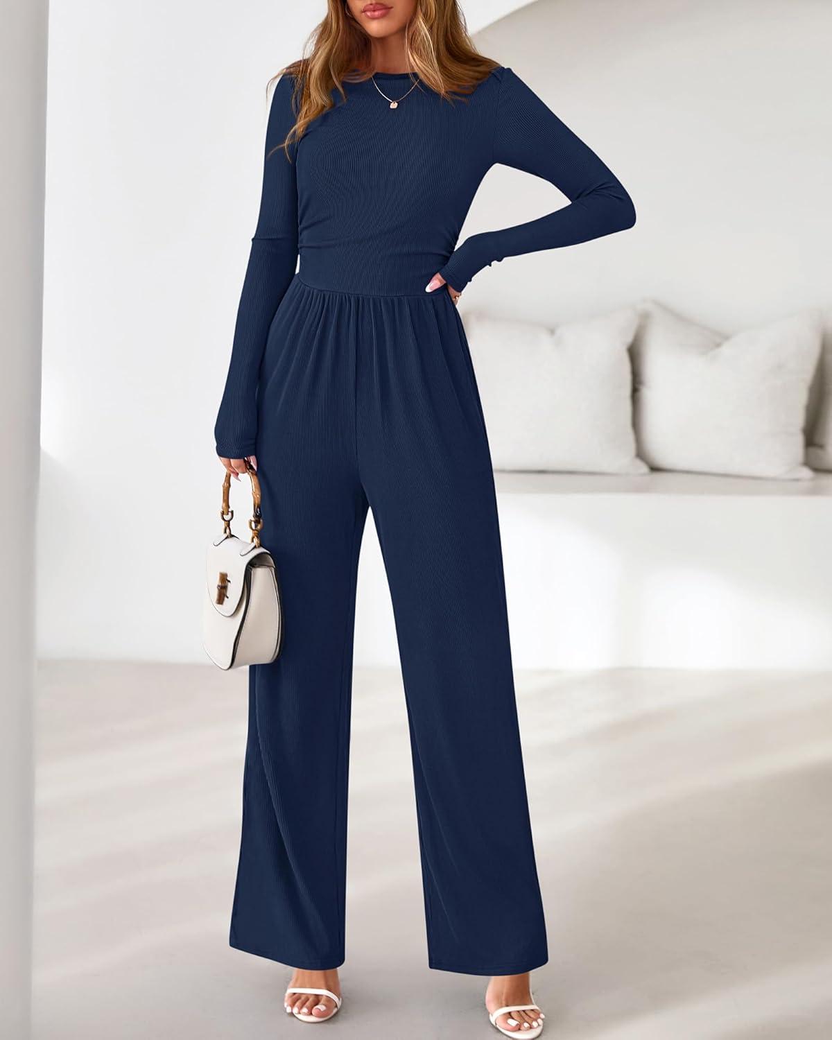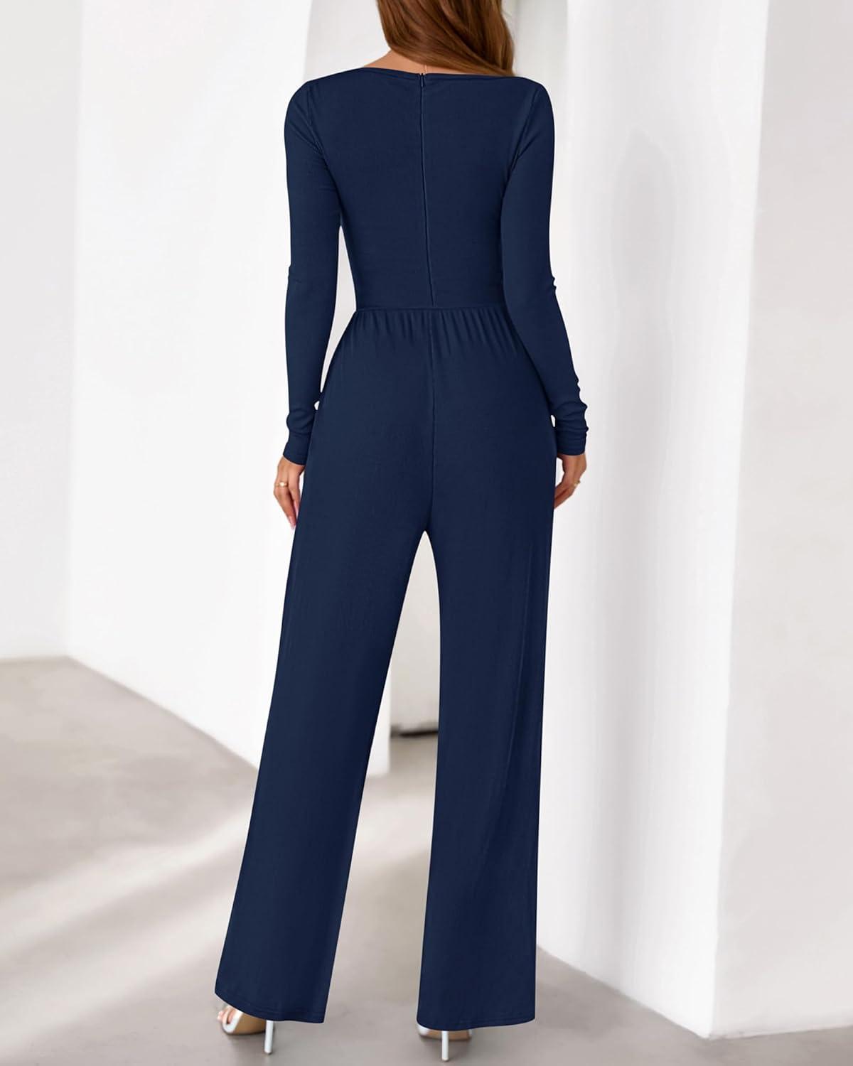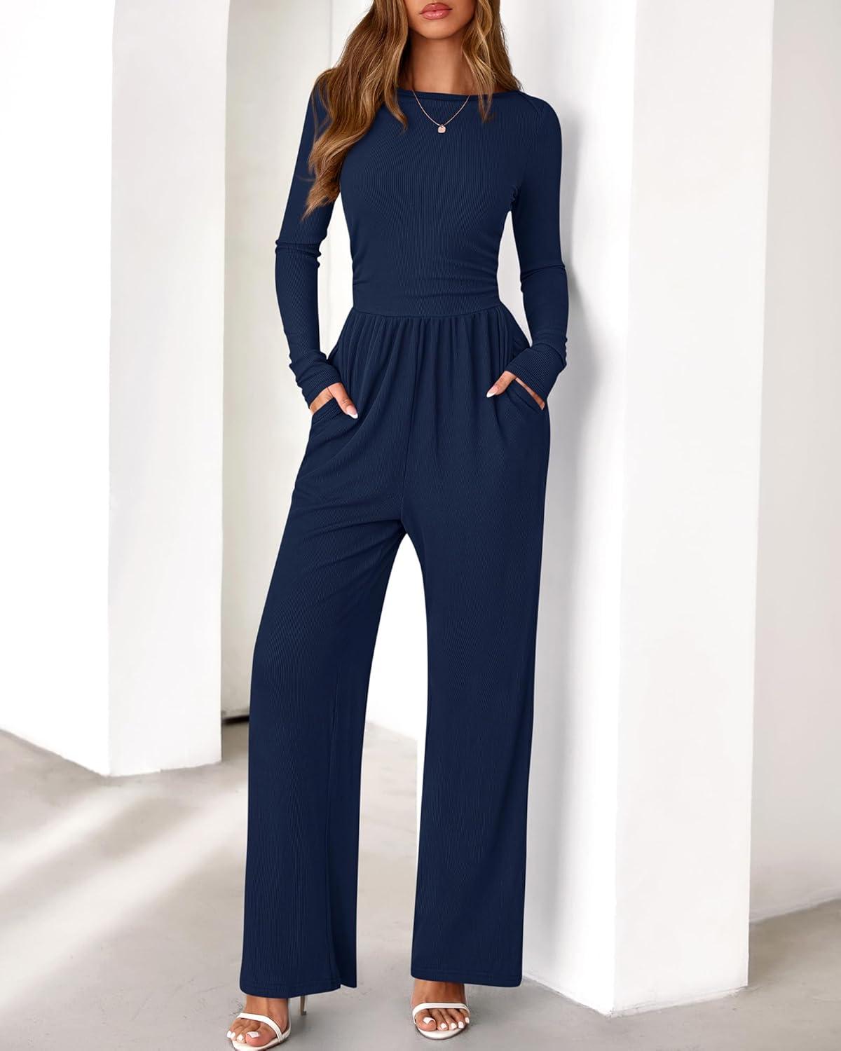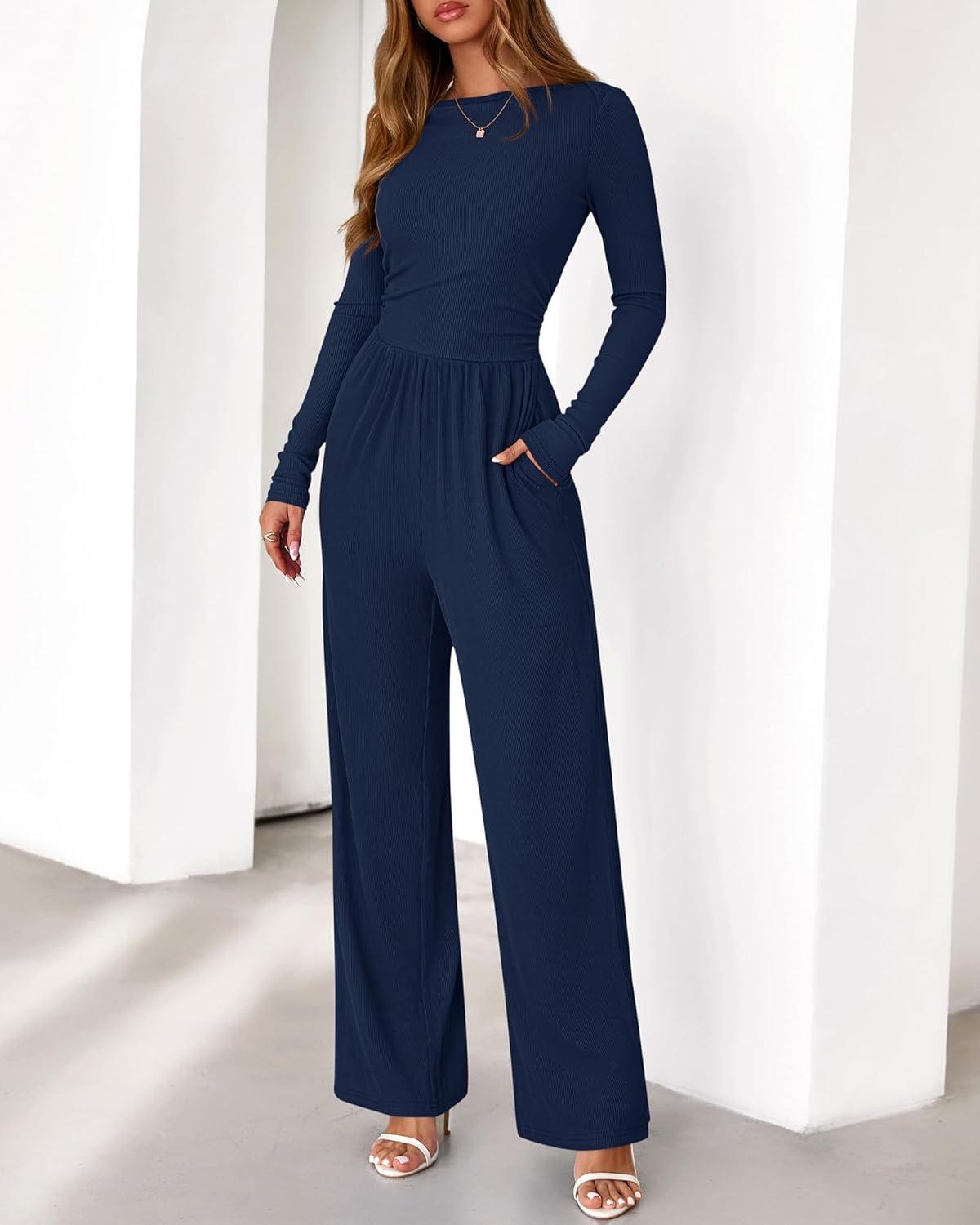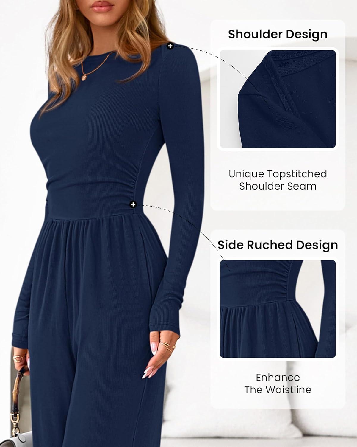 BTFBM Jumpsuits For Women Dressy 2025 Fall Casual One Piece Outfits Pocket Long Sleeve Knit Ruched Wide Leg Pants Romper(Navy)