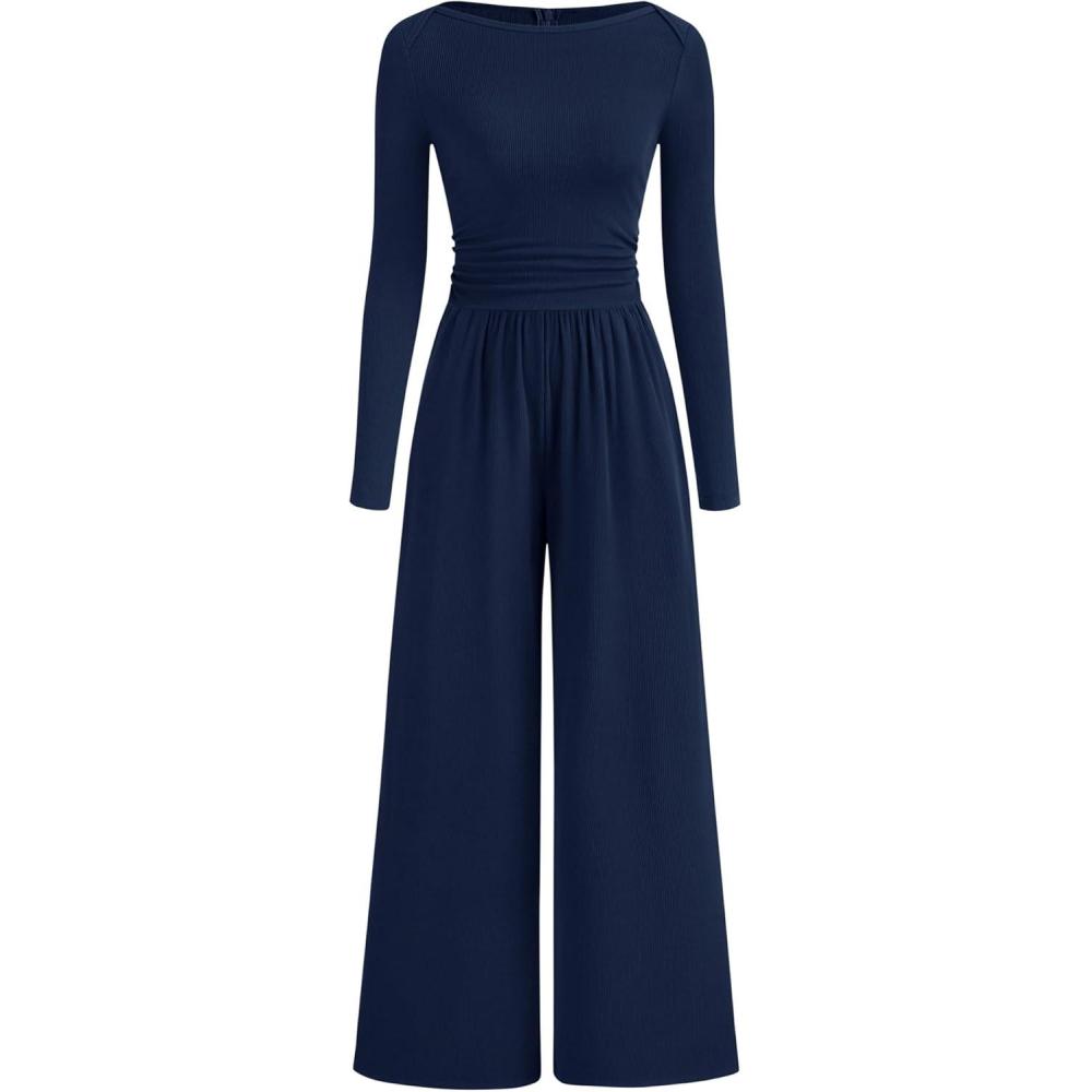 imageBTFBM Jumpsuits For Women Dressy 2025 Fall Casual One Piece Outfits Pocket Long Sleeve Knit Ruched Wide Leg Pants RomperNavy