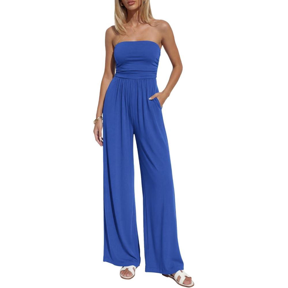 BTFBM Jumpsuits For Women Summer 2026 Beach Vacation Strapless Tube Top Jumpsuit Ruched Casual Wide Leg Pant Rompers(Blue)