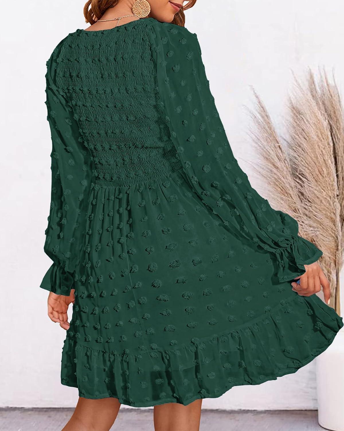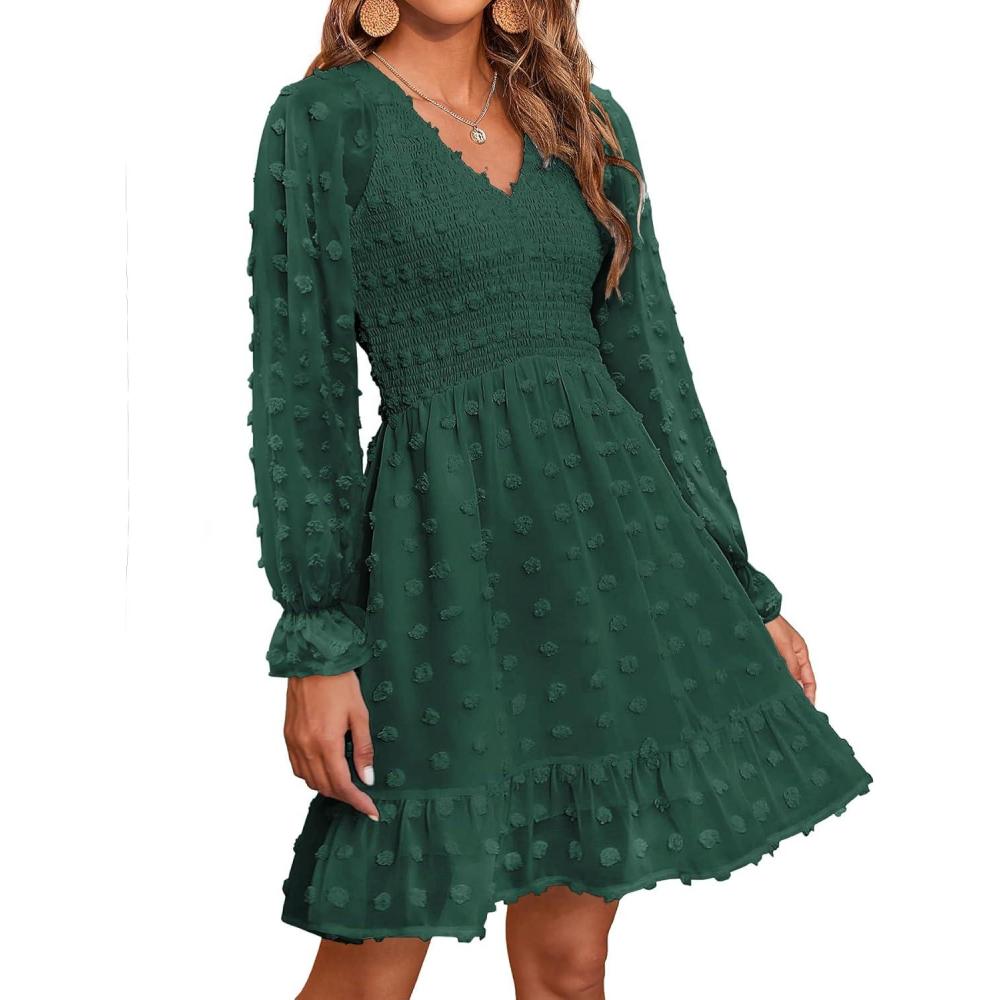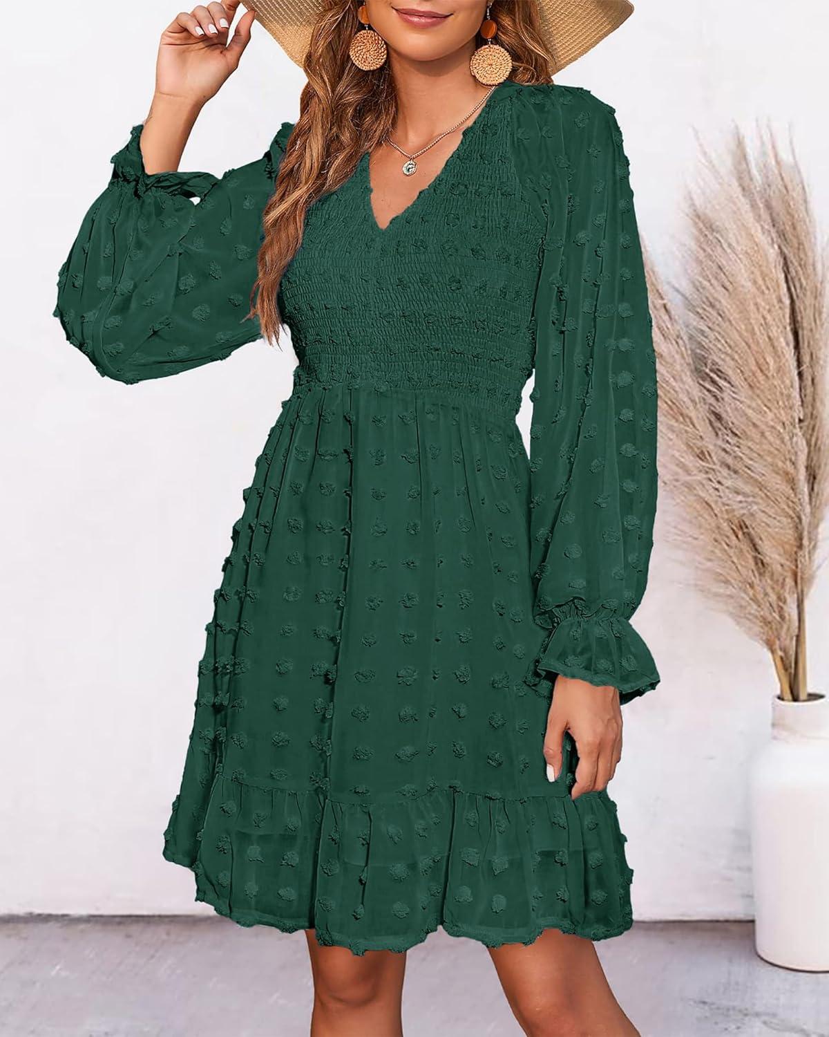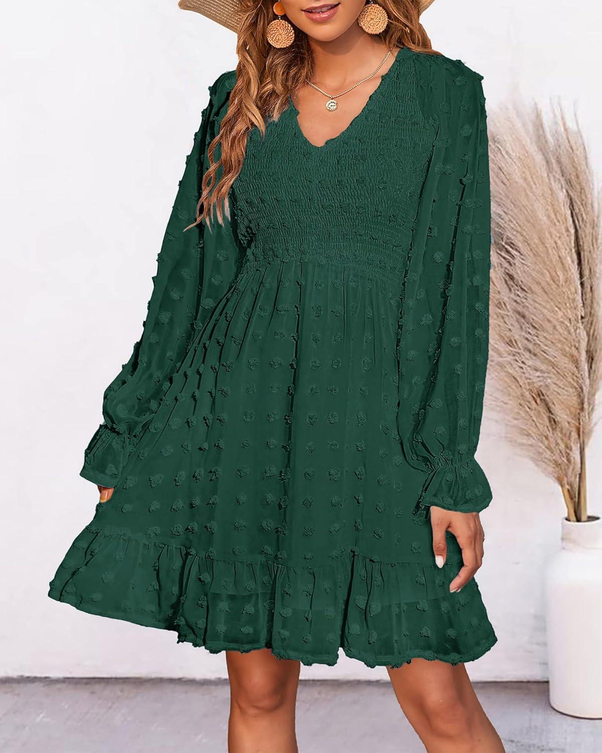 BTFBM Long Sleeve Fall Dresses for Women 2025 Casual V Neck Swiss Dot Smocked Ruffle Chiffon Summer Flowy Mini Dress(Dark Green)