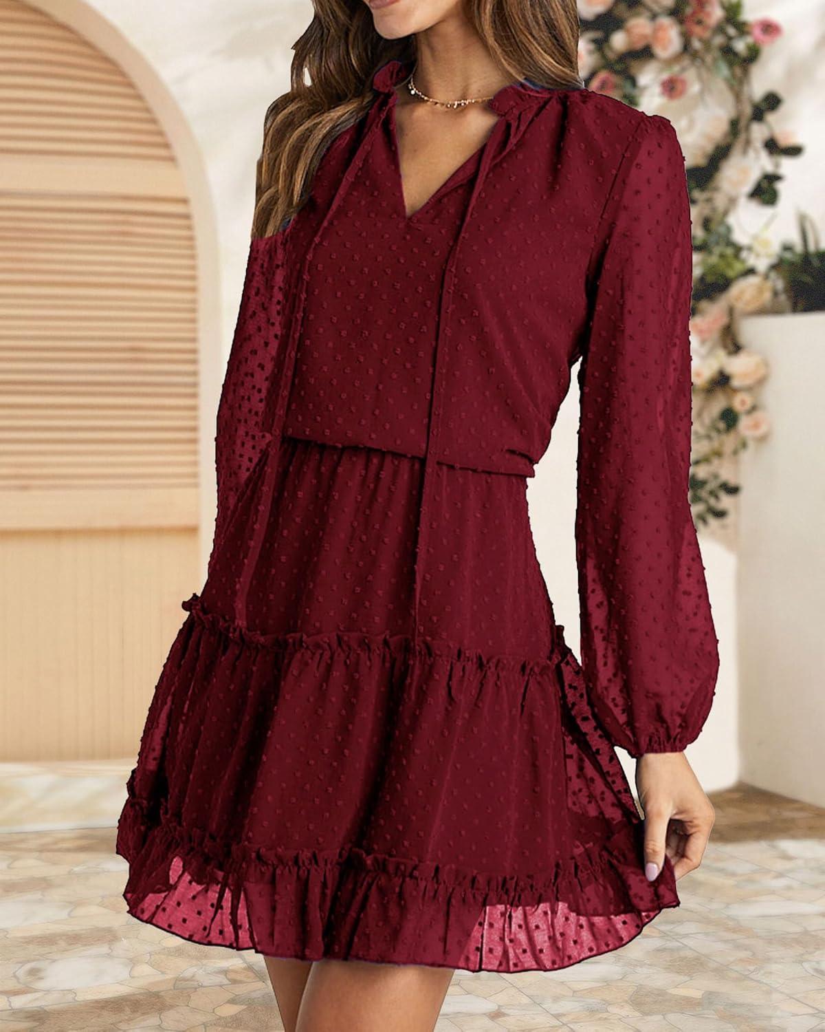 BTFBM Long Sleeve Fall Dresses for Women 2025 Summer Casual Tie Neck Ruffle Tiered A Line Wedding Guest Short Mini Dress(Dot Wine Red)