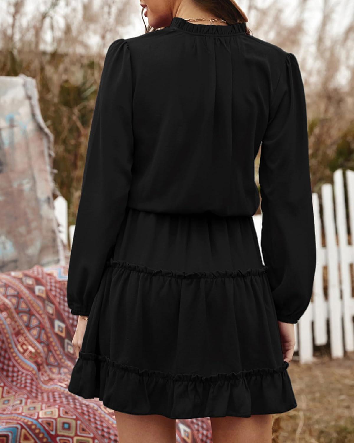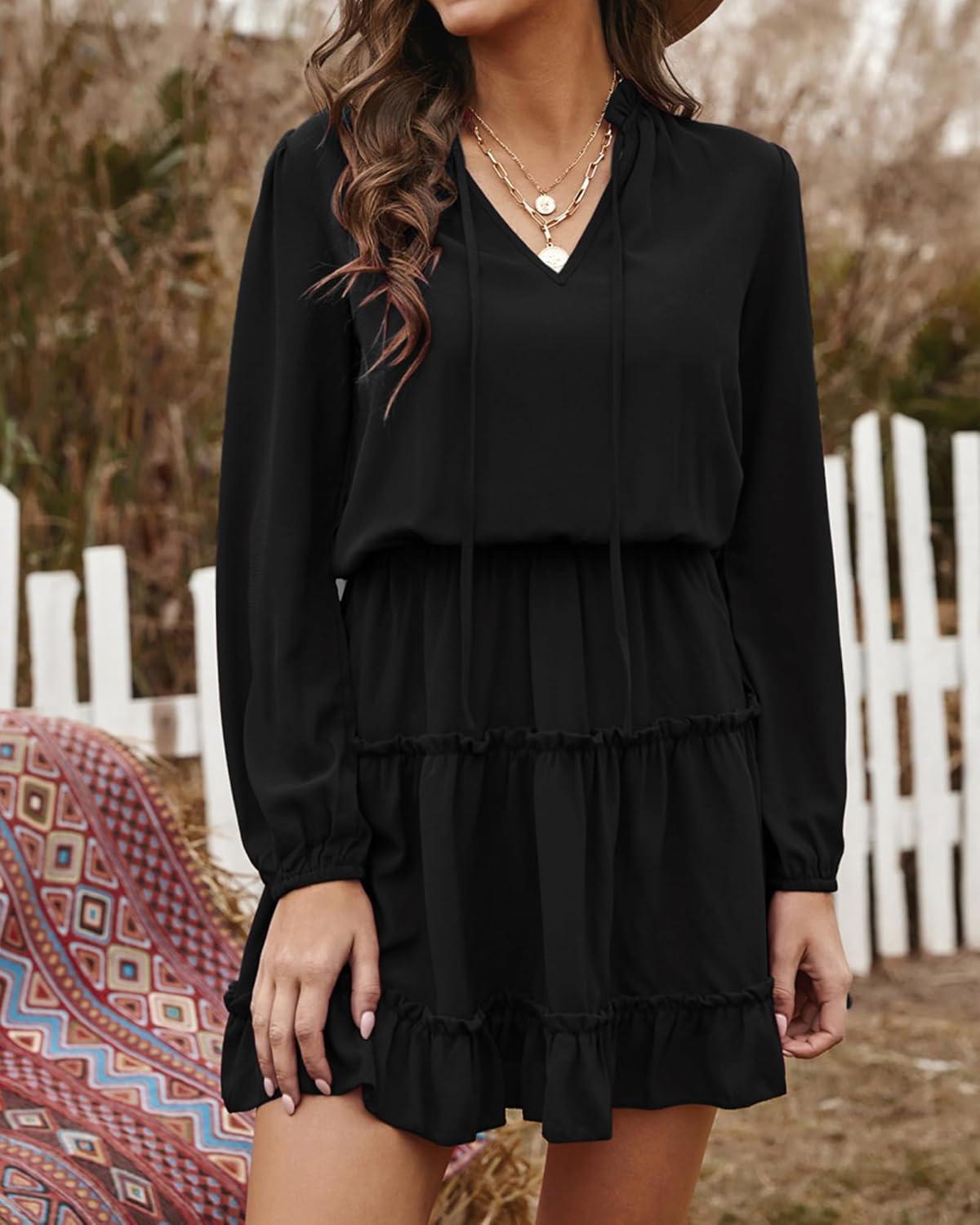 BTFBM Long Sleeve Fall Dresses for Women 2025 Summer Casual Tie Neck Ruffle Tiered A Line Wedding Guest Short Mini Dress(Long Sleeve Black)