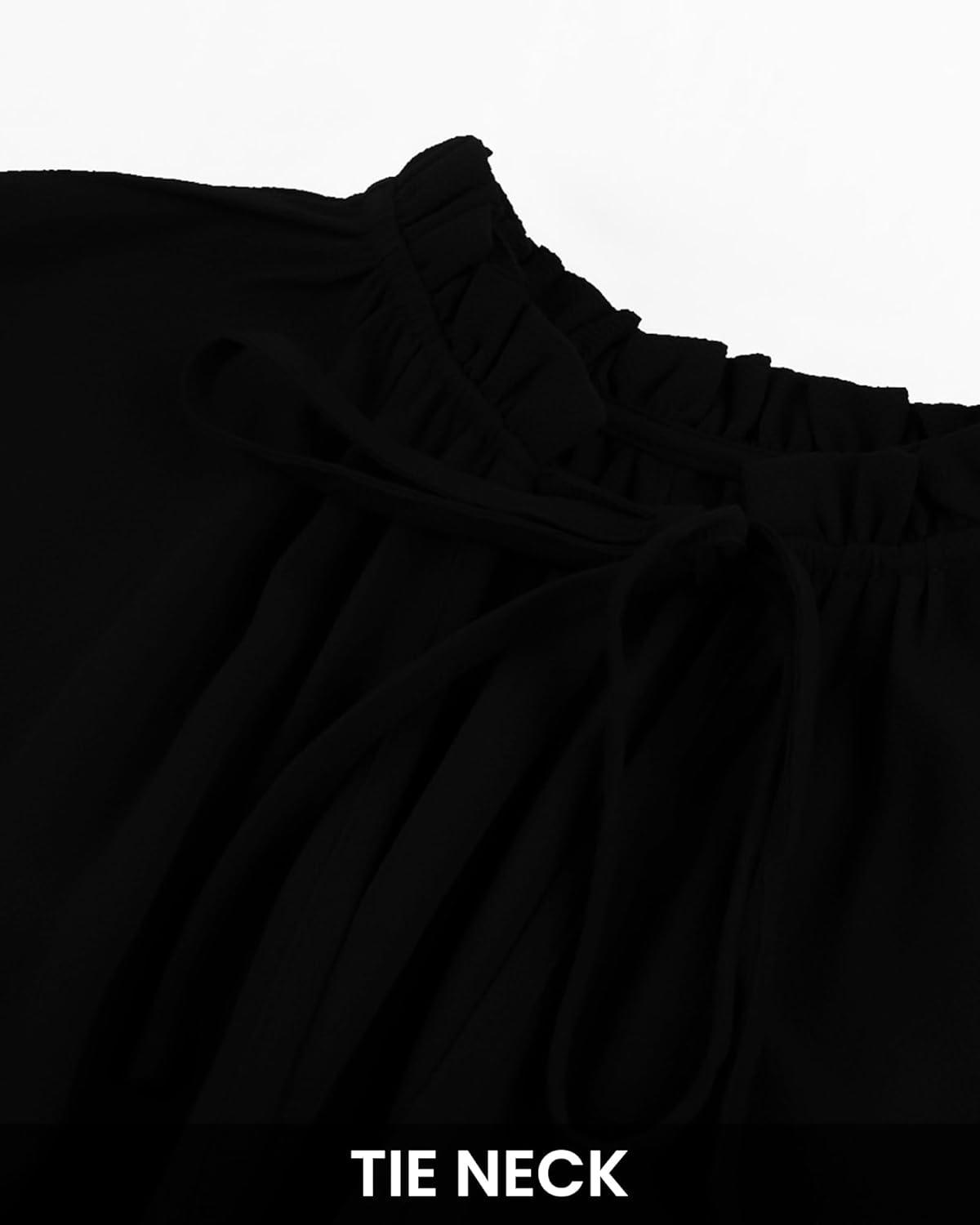 imageBTFBM Long Sleeve Fall Dresses for Women 2025 Summer Casual Tie Neck Ruffle Tiered A Line Wedding Guest Short Mini DressLong Sleeve Black