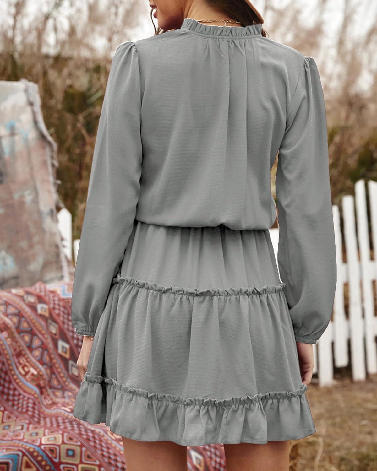 BTFBM Long Sleeve Fall Dresses for Women 2025 Summer Casual Tie Neck Ruffle Tiered A Line Wedding Guest Short Mini Dress(Long Sleeve Grey)