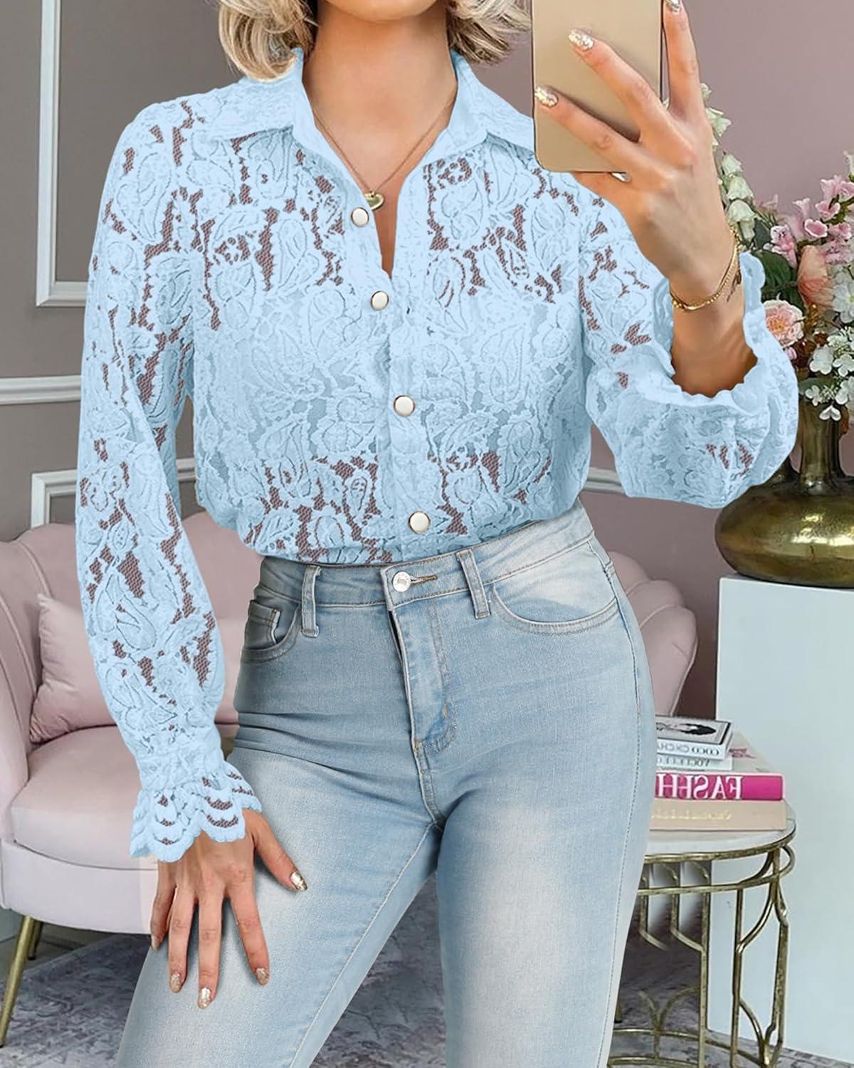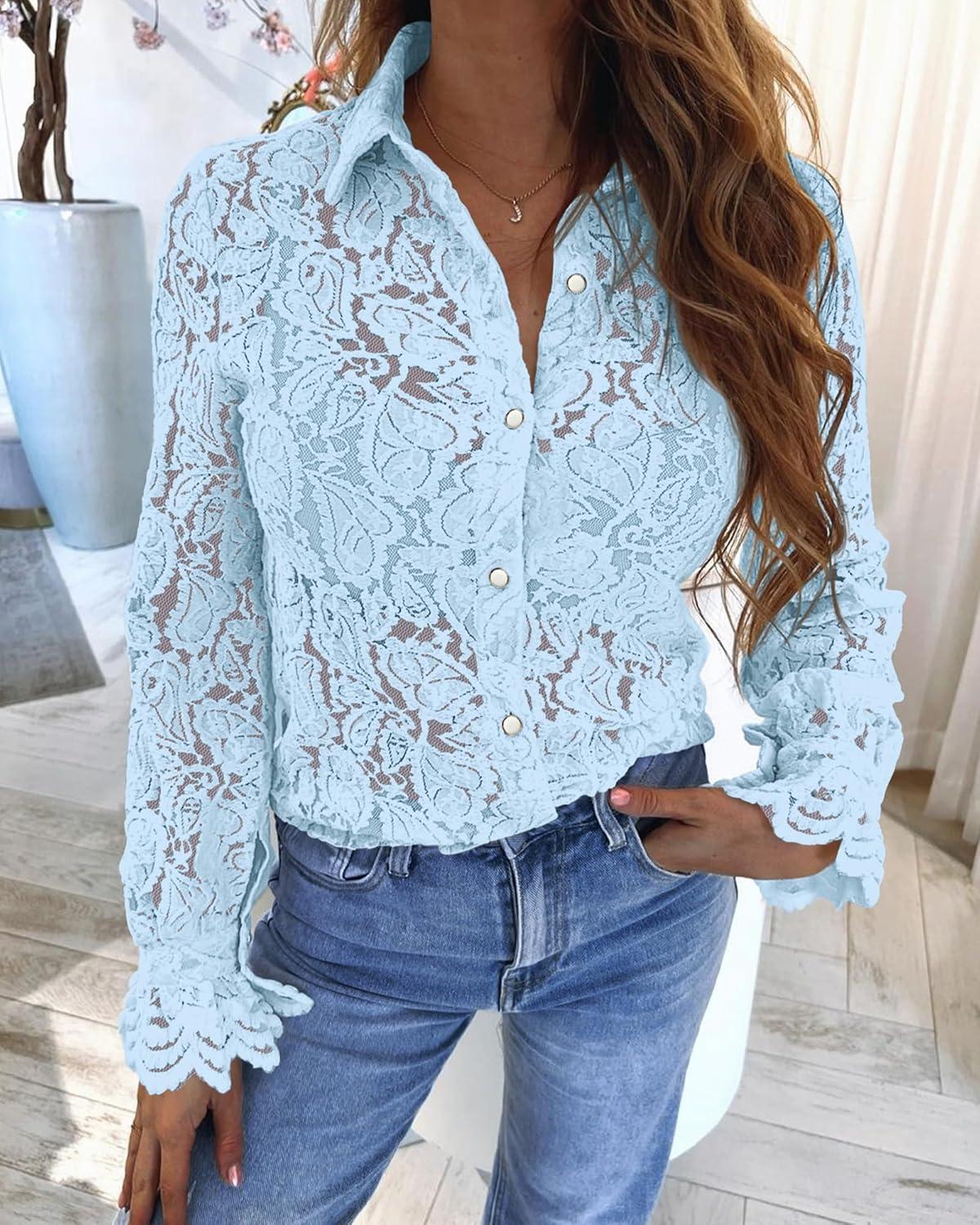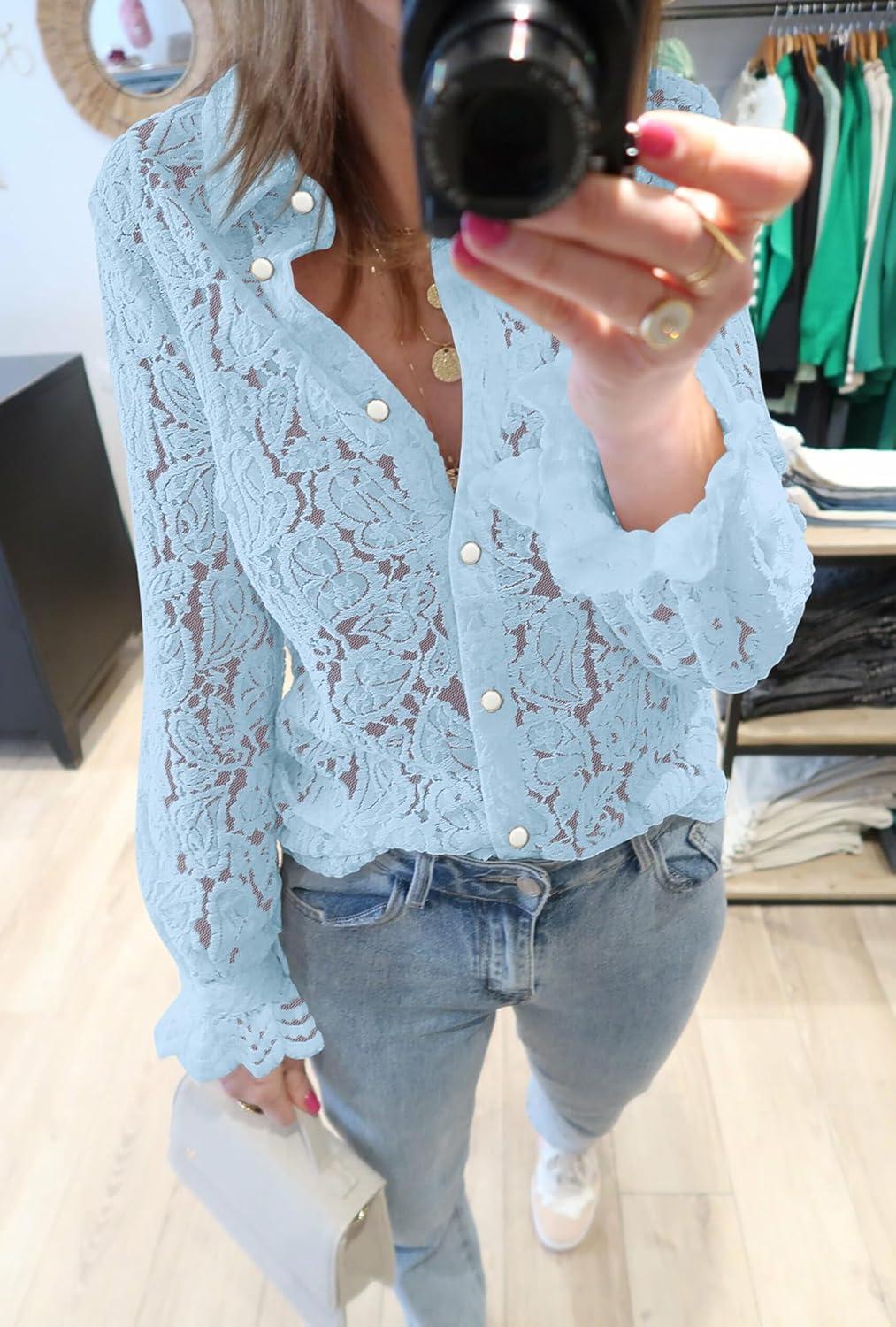 imageBTFBM Long Sleeve Lace Blouses for Women 2025 Spring Dressy Casual Button Down Shirts Date Night Outfit Club Party TopsLight Blue