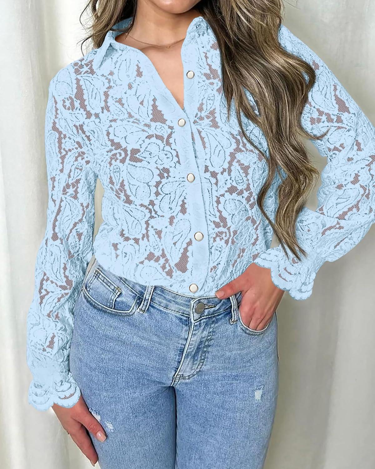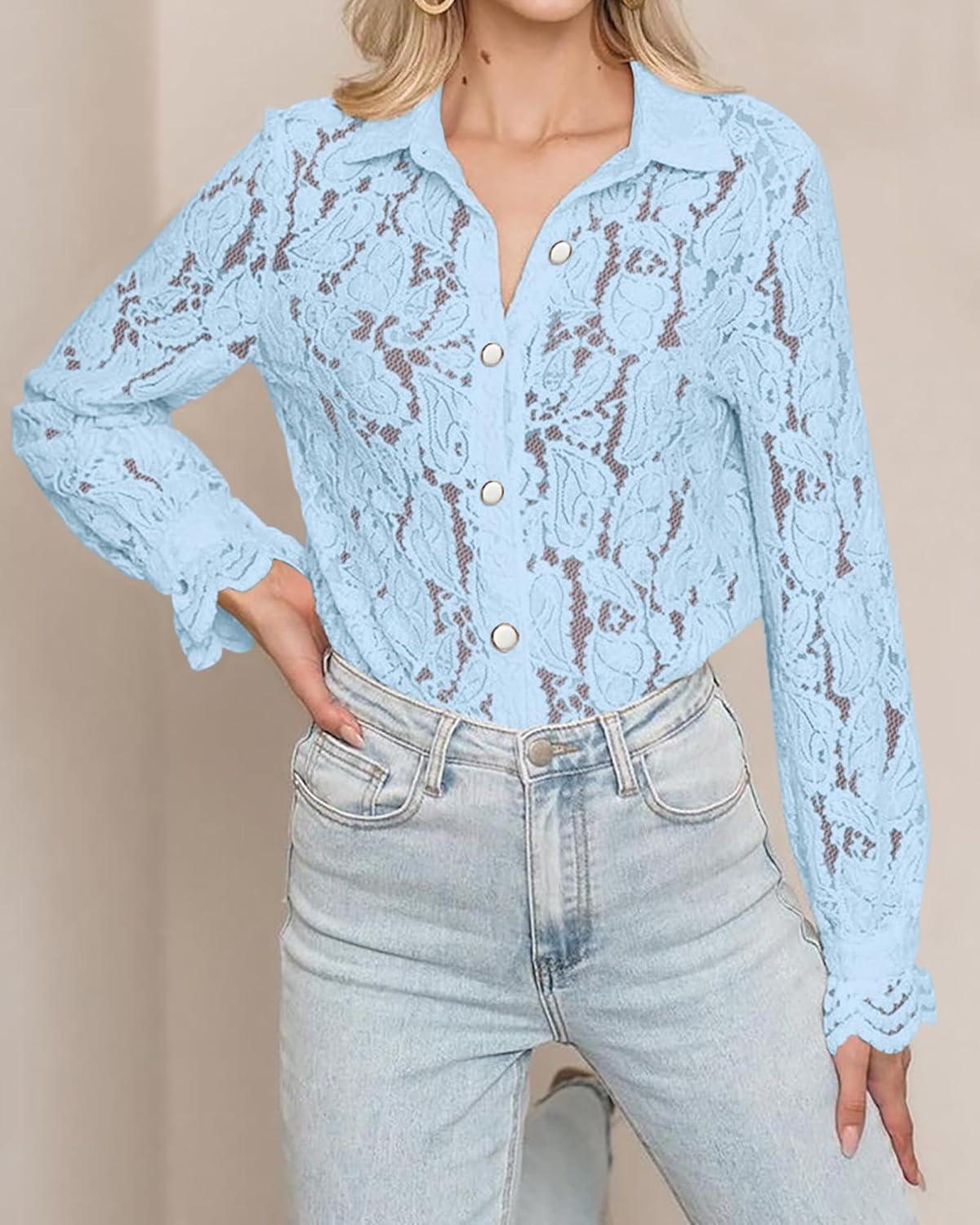 BTFBM Long Sleeve Lace Blouses for Women 2025 Spring Dressy Casual Button Down Shirts Date Night Outfit Club Party Tops(Light Blue)