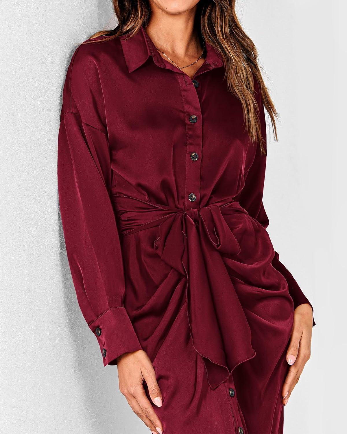 BTFBM Maxi Dresses for Women Fall 2025 Long Sleeve Lapel Neck Button Down Elegant Satin Belted Ruched Summer Shirt Dress(Dark Wine Red)
