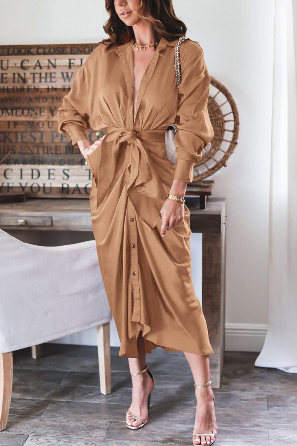 BTFBM Maxi Dresses for Women Fall 2025 Long Sleeve Lapel Neck Button Down Elegant Satin Belted Ruched Summer Shirt Dress(Light Khaki)