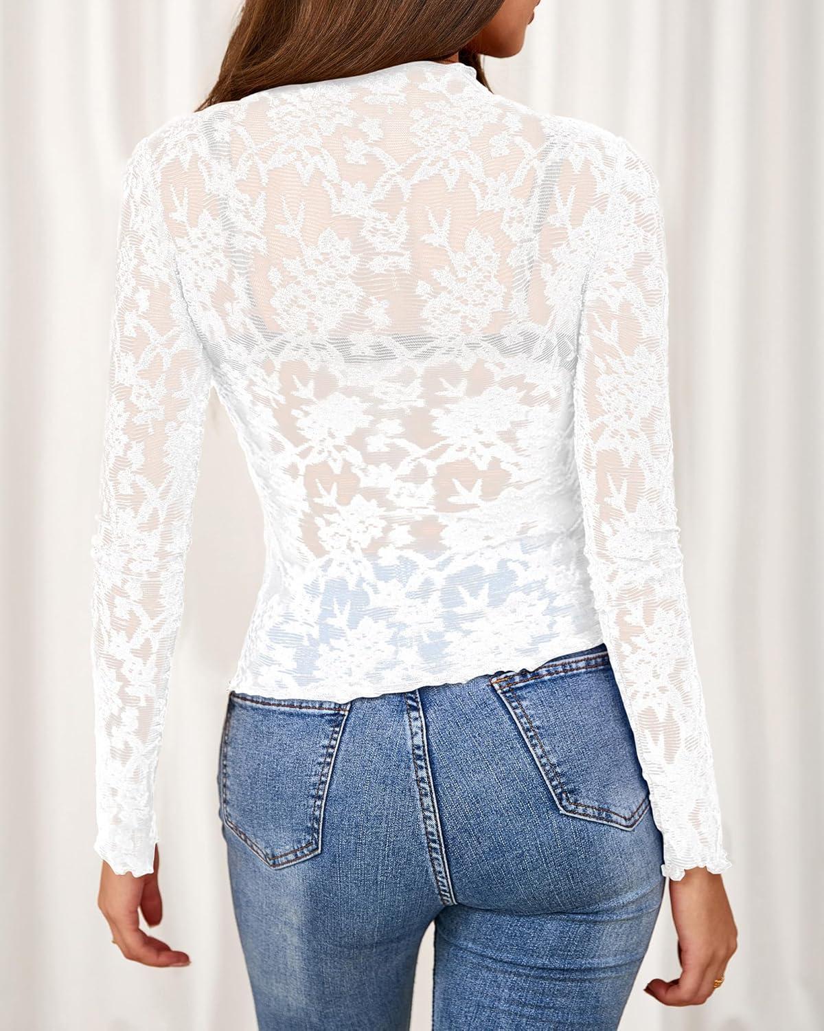 BTFBM Mesh Long Sleeve Tops for Women Lace Sexy Sheer See Through Crew Neck Tight Shirt Fall 2025 Party Club Outfits(White)