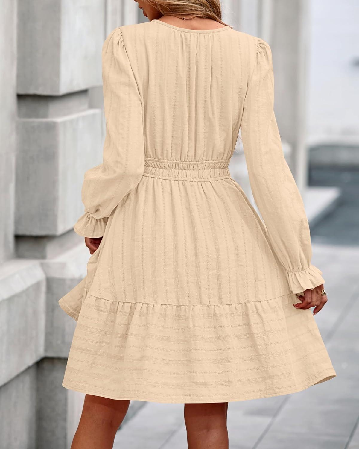BTFBM Mini Dresses for Women 2025 Casual Lightweight Long Sleeve V Neck A Line Elastic Waist Party Holiday Dress(Apricot)