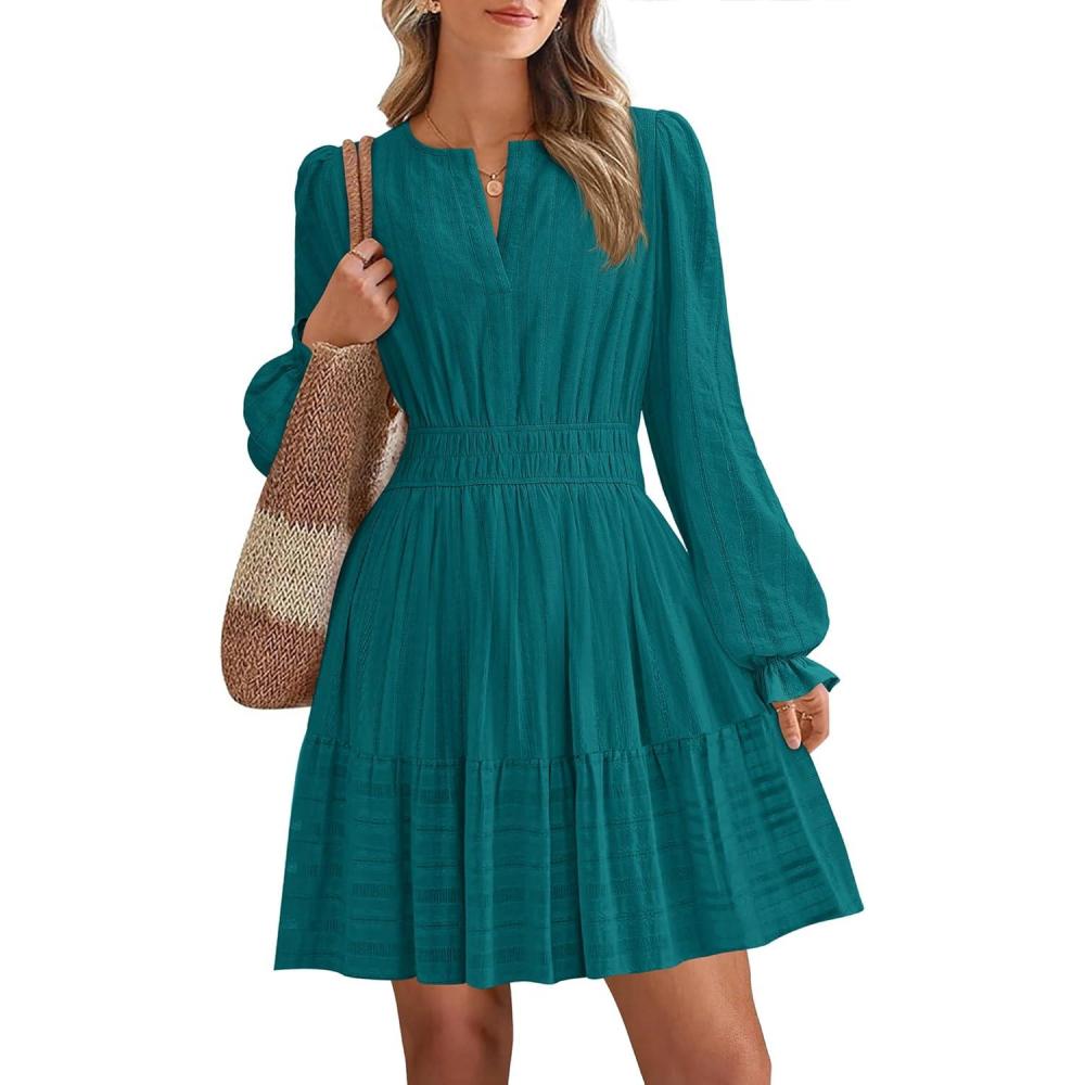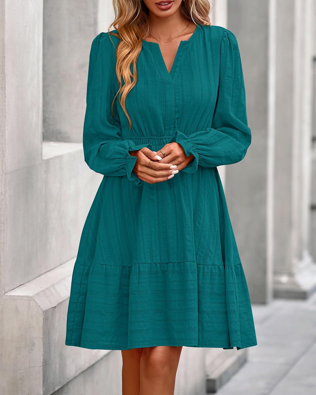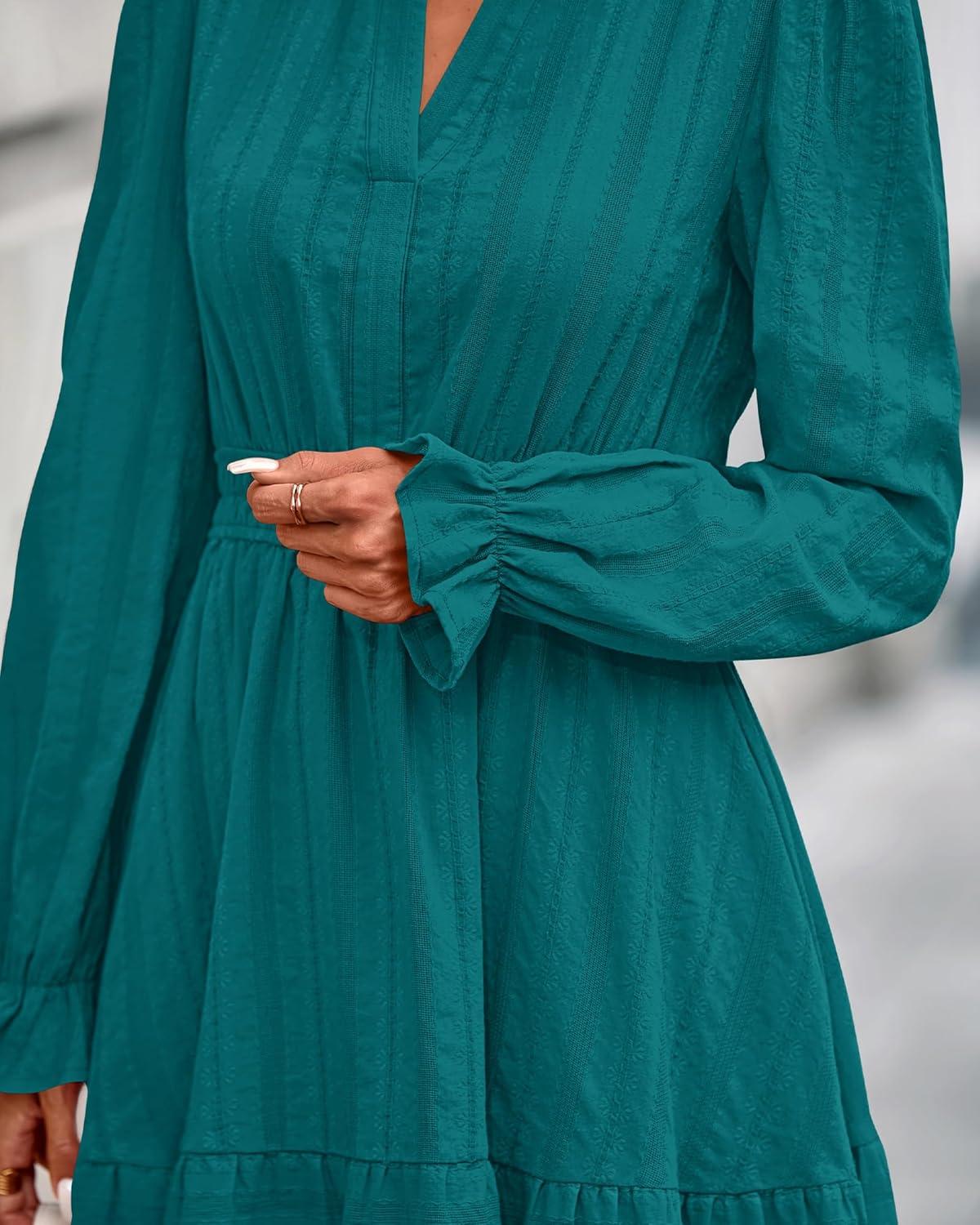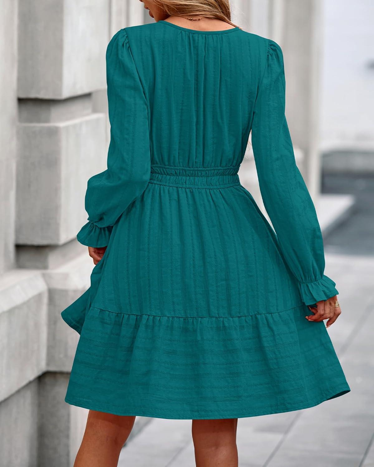 BTFBM Mini Dresses for Women 2025 Casual Lightweight Long Sleeve V Neck A Line Elastic Waist Party Holiday Dress(Malachite Green)