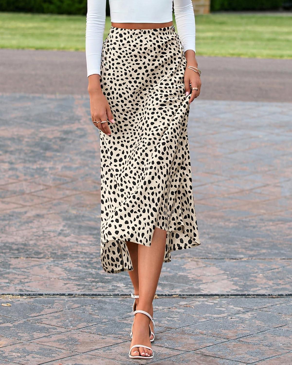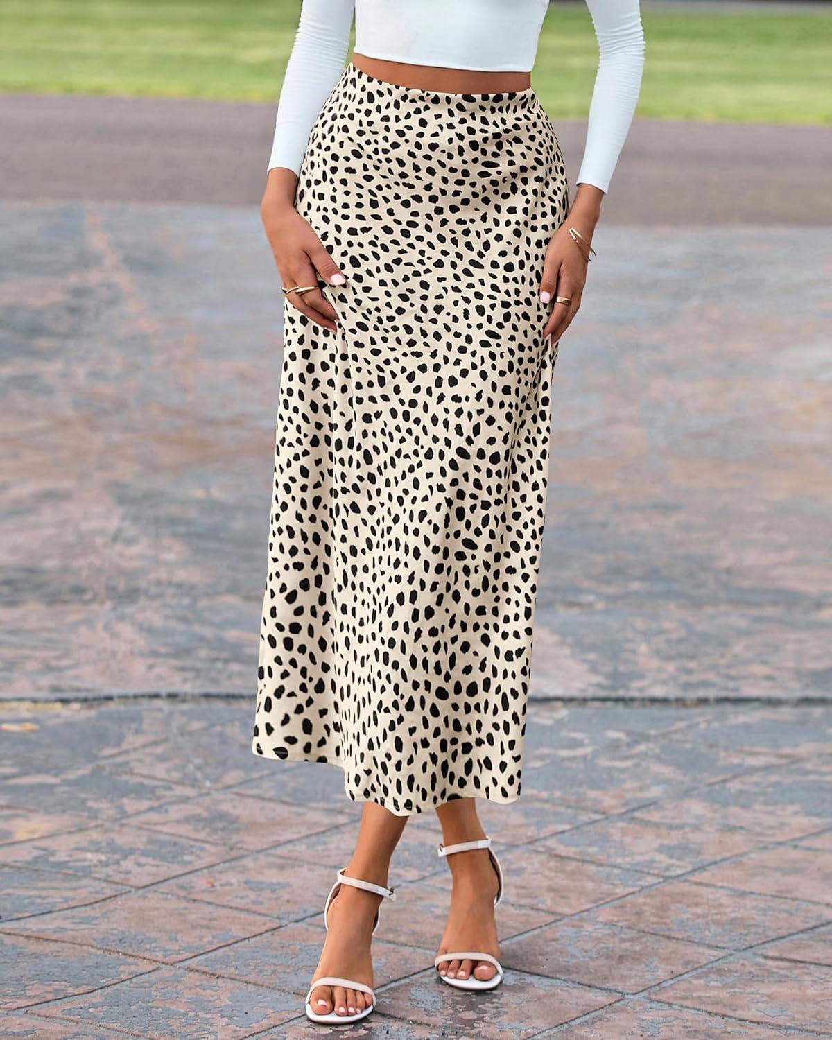 BTFBM Satin Skirts for Women 2025 Fall High Waisted A-Line Leopard Print Cocktail Wedding Long Silk Summer Midi Skirt(Apricot Black)