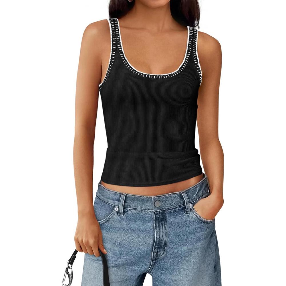 BTFBM Sleeveless Tops for Women 2026 Summer Scoop Neck Tank Ribbed Knit Slim Fit Sweater Vest Casual Beach Vacation(Black)
