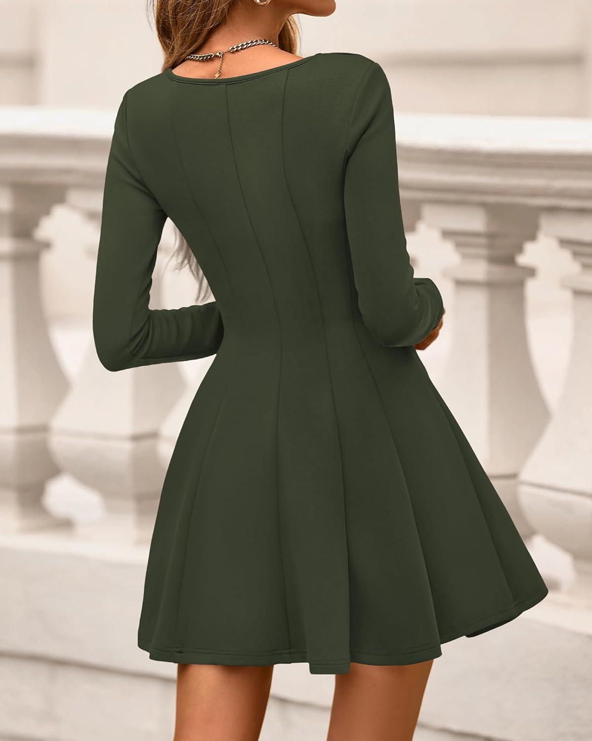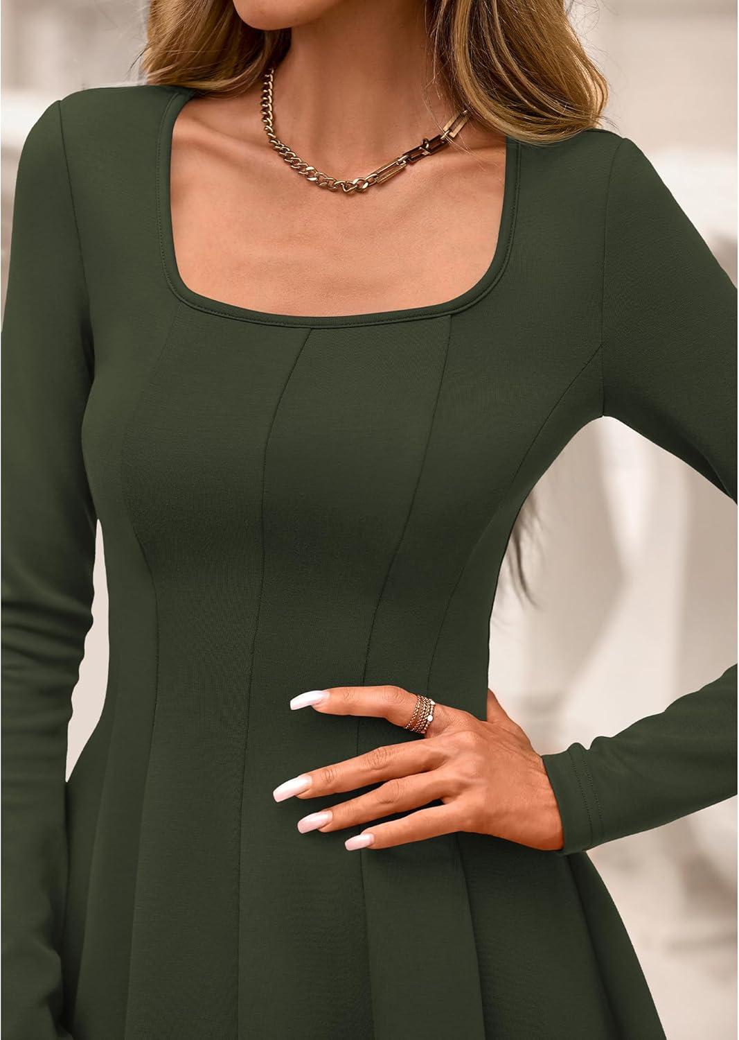 BTFBM Square Neck Dress for Women Casual Fall Long Sleeve Knit Pleated Elegant Classy 2025 A Line Club Party Mini Dress(Army Green)