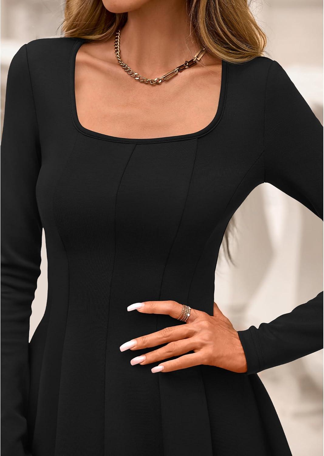 BTFBM Square Neck Dress for Women Casual Fall Long Sleeve Knit Pleated Elegant Classy 2025 A Line Club Party Mini Dress(Black)