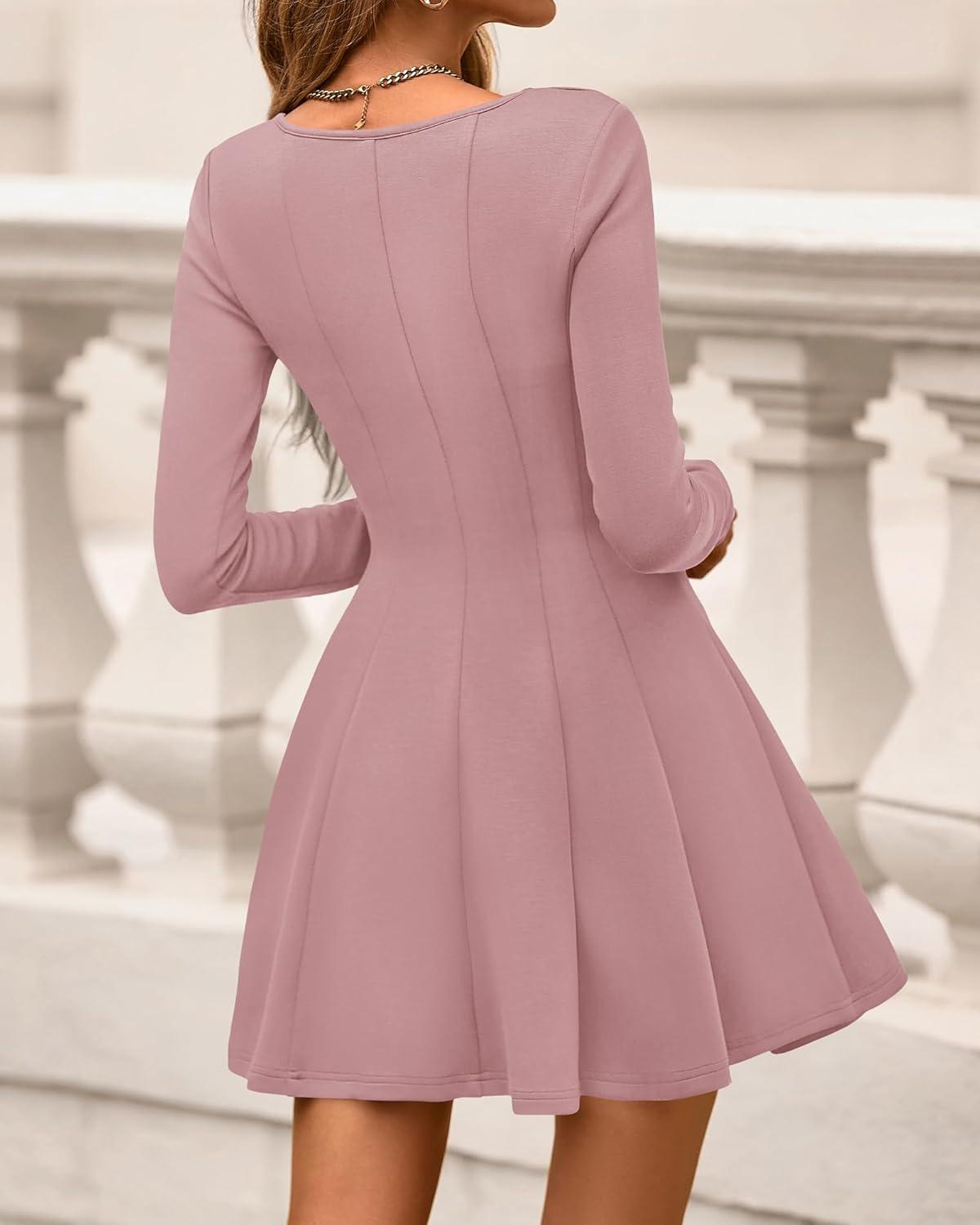 BTFBM Square Neck Dress for Women Casual Fall Long Sleeve Knit Pleated Elegant Classy 2025 A Line Club Party Mini Dress(Pink)