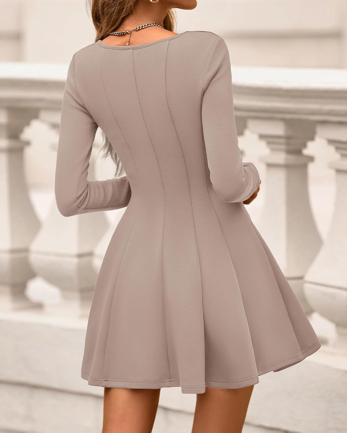 BTFBM Square Neck Dress for Women Casual Fall Long Sleeve Knit Pleated Elegant Classy 2025 A Line Cocktail Mini Dresses(Khaki)