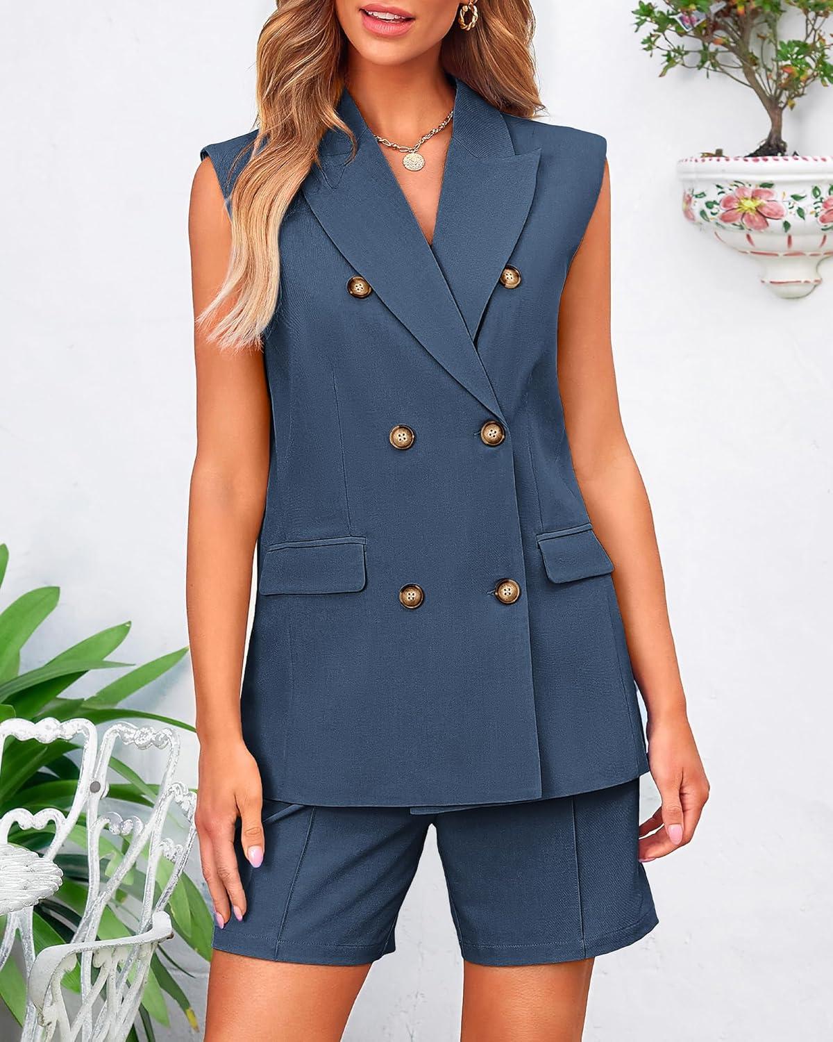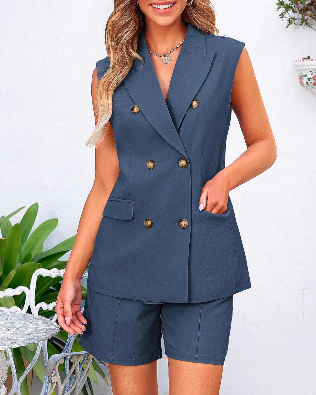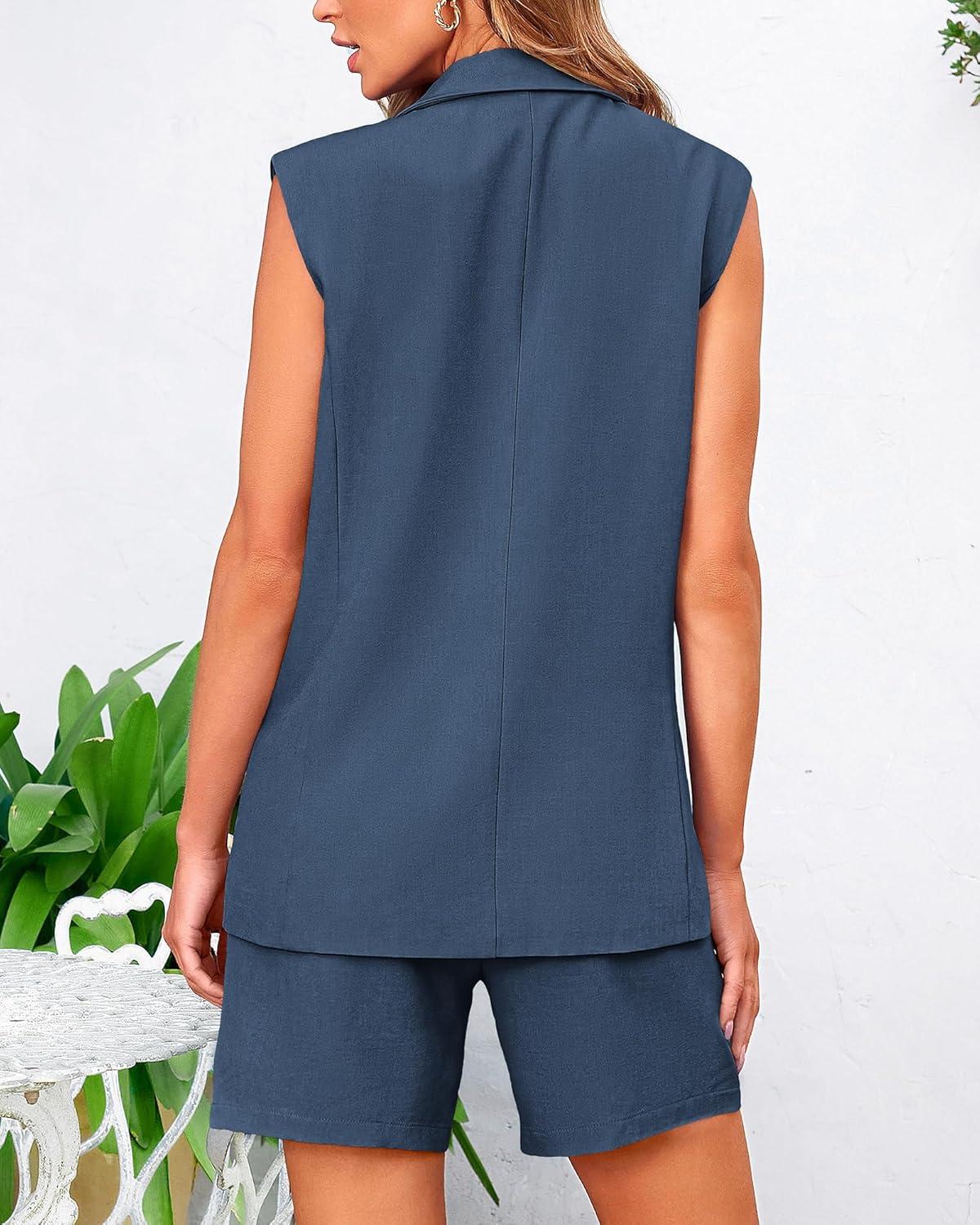 BTFBM Two Piece Sets For Women Summer 2025 Pockets Button Down Sleeveless Vest And Shorts Work Business Casual Outfits(Denim Blue)